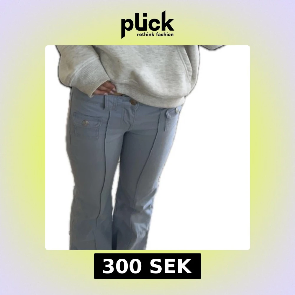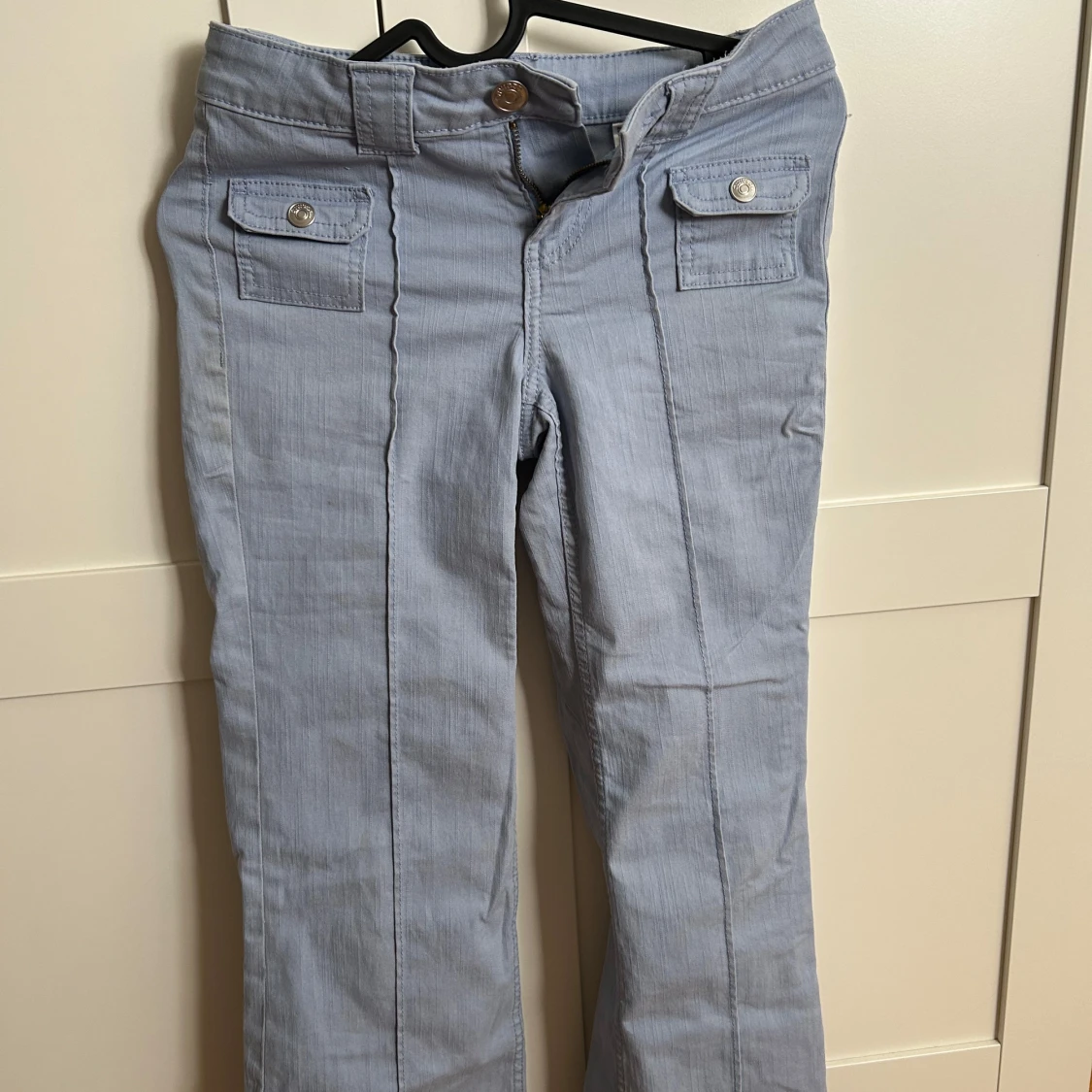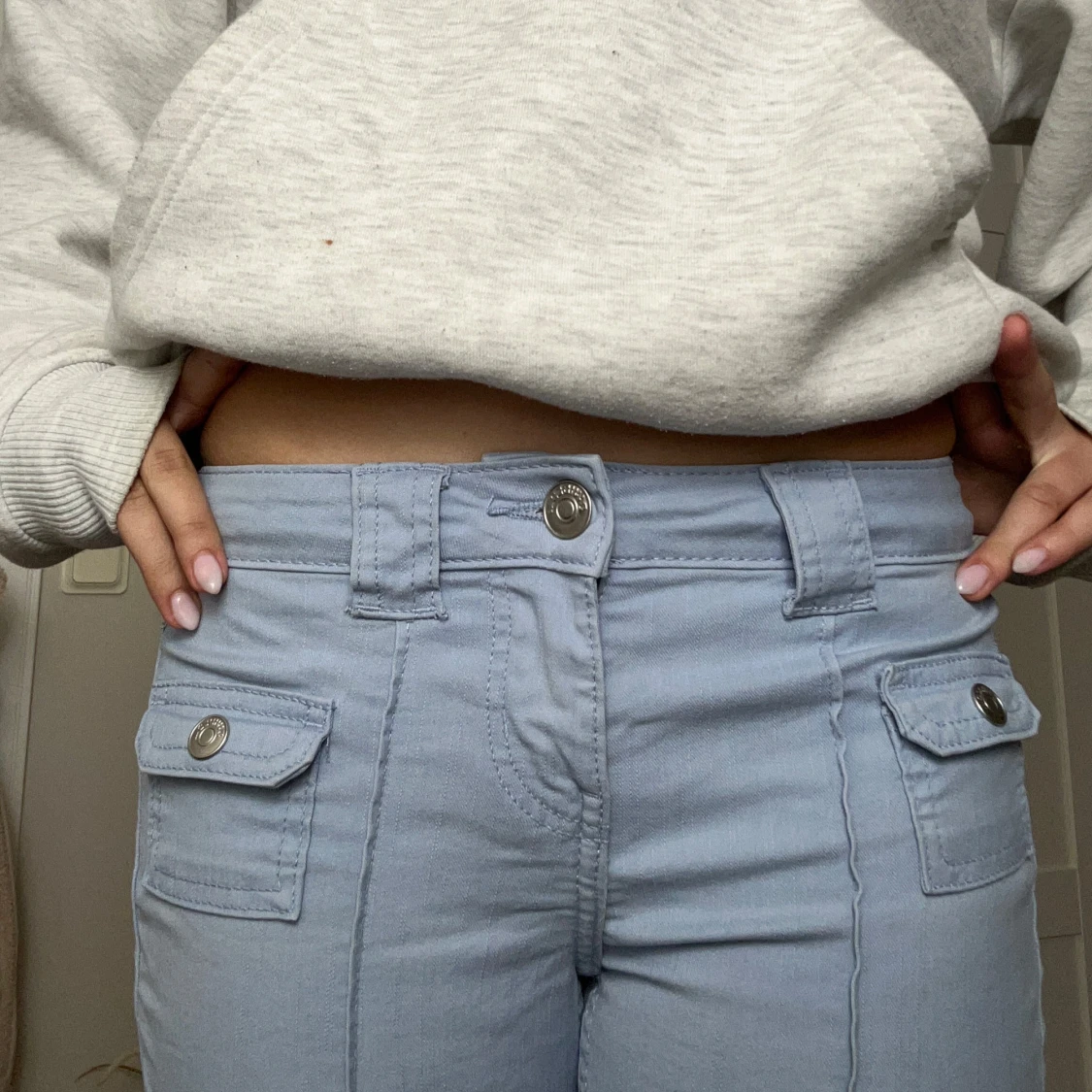 Populära ljusblå/lila jeans från hm som har bootcut passform och dekorativa fickor framtill med lock och knapp. Byxorna har låg midja och markerade sömmar längs benen. Perfekta för en trendig och avslappnad look.