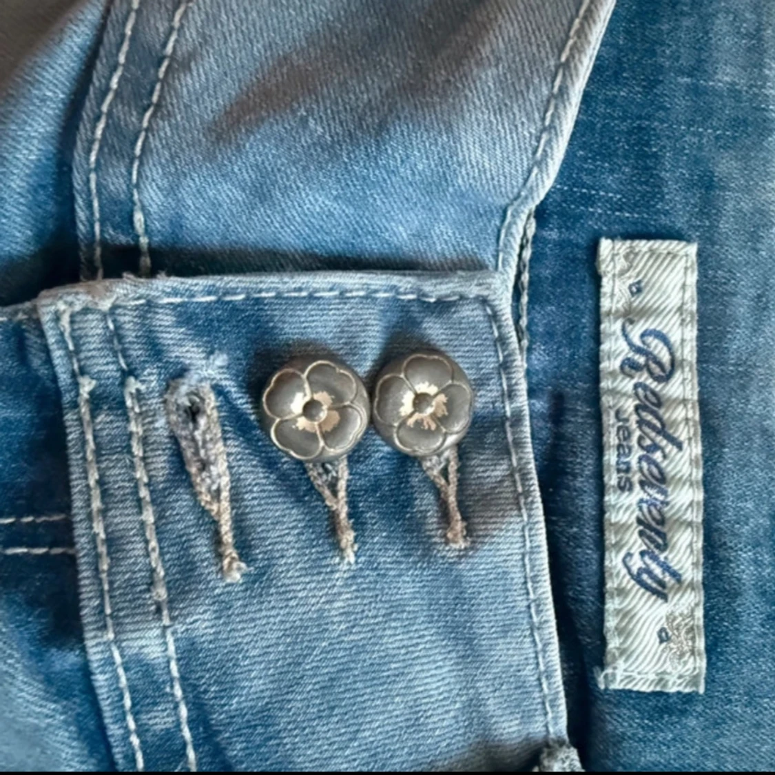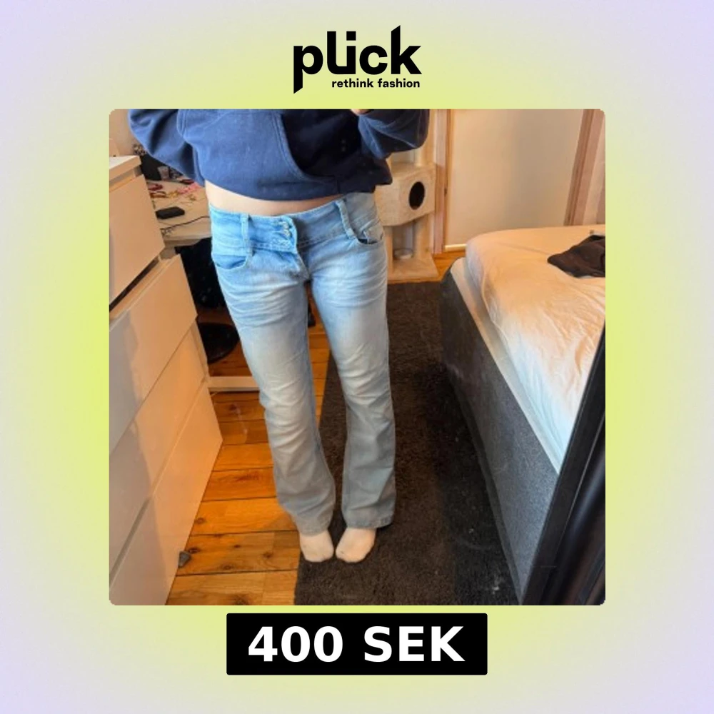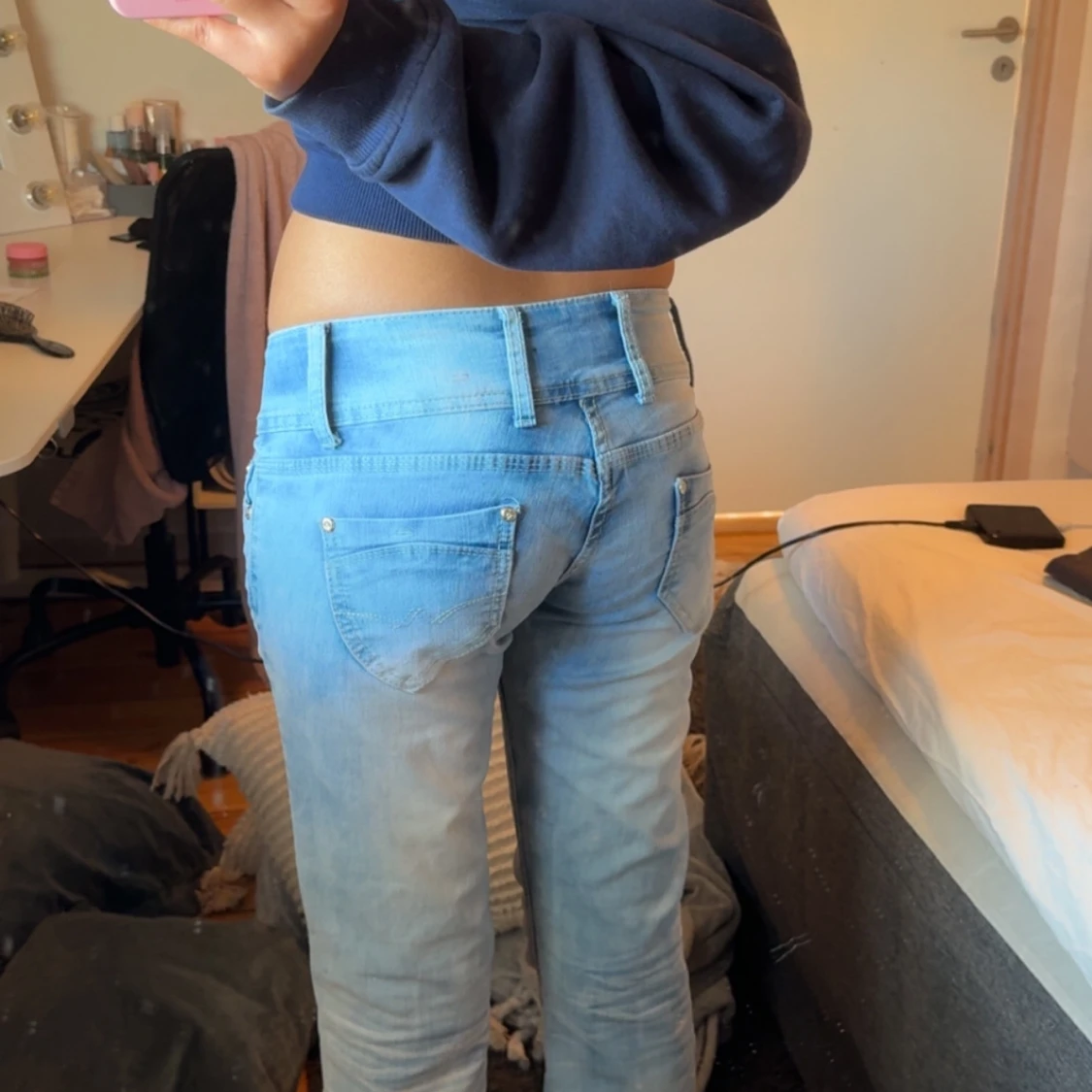 Snygga ljusblå, low waist, bootcut jeans med unika blomformade knappar. Byxorna har en klassisk femficksdesign och en bekväm passform. Perfekta för en avslappnad stil. Innerbenslängden: ca 81cm. Midjemått: ca 38cm. Knapp saknas längst ner, men tycker inte det är särskilt synligt, därav lägre pris.