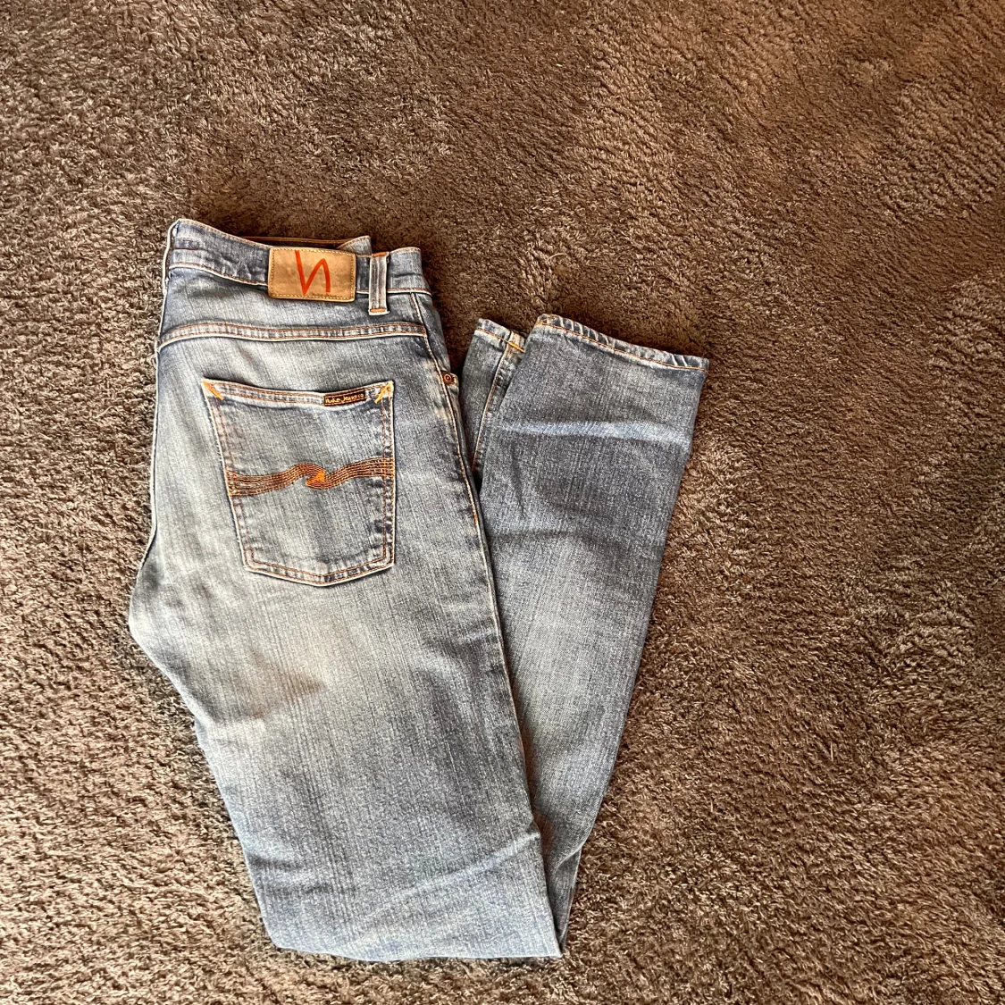 Säljer mina nudie jeans i storlek 31/34 då jag behöver pengar. Hål i skrevet skriv för bild(enkelt att sy)
