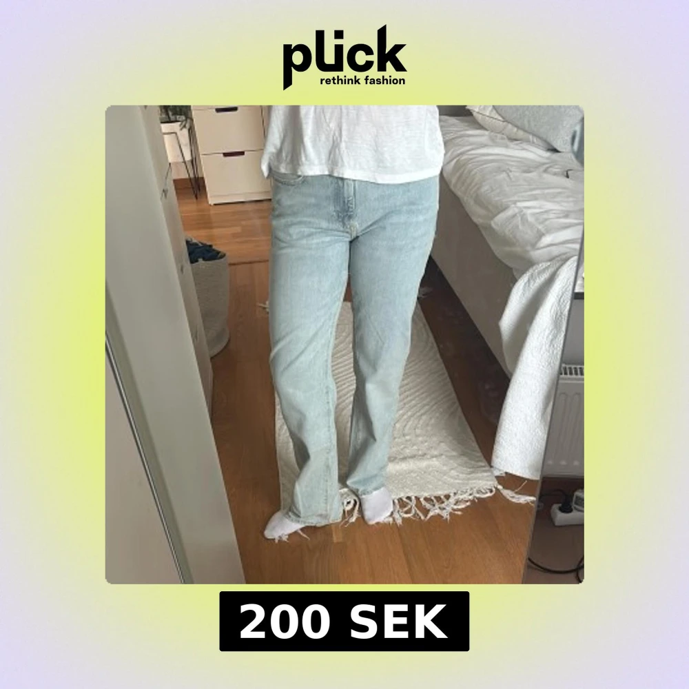 Säljer ett par ljusblå jeans från BikBok med rak passform och midwaist. Jeansen har klassisk femficksdesign och stängs med dragkedja och knapp. Perfekta för en avslappnad stil. Helt nya aldrig använda💞