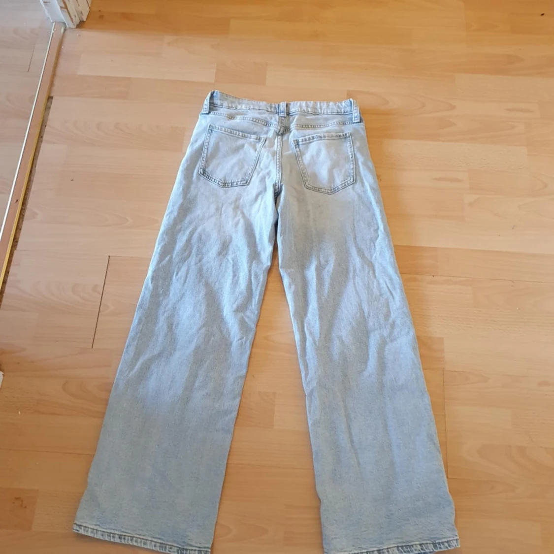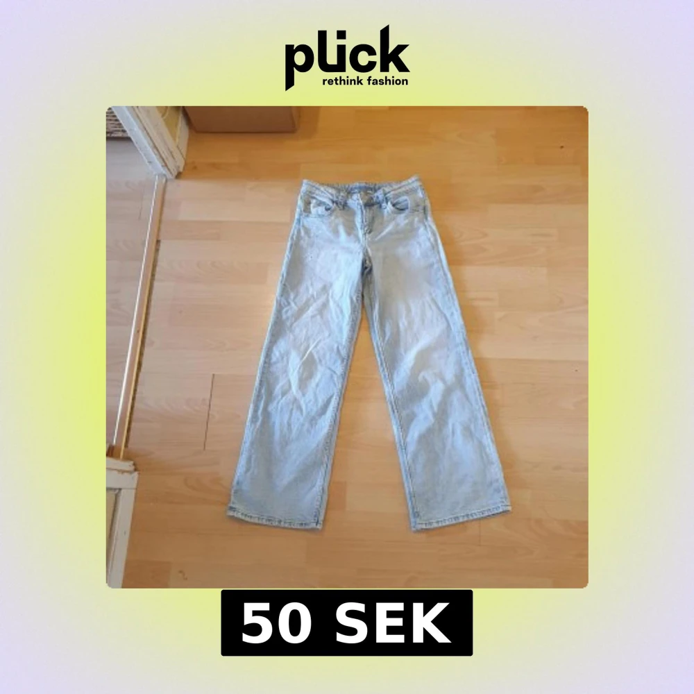 Säljer ett par ljusblå jeans med rak passform och klassisk femficksdesign. Jeansen har normal midja och är tillverkade i bomull. Perfekta för en avslappnad och stilren look.