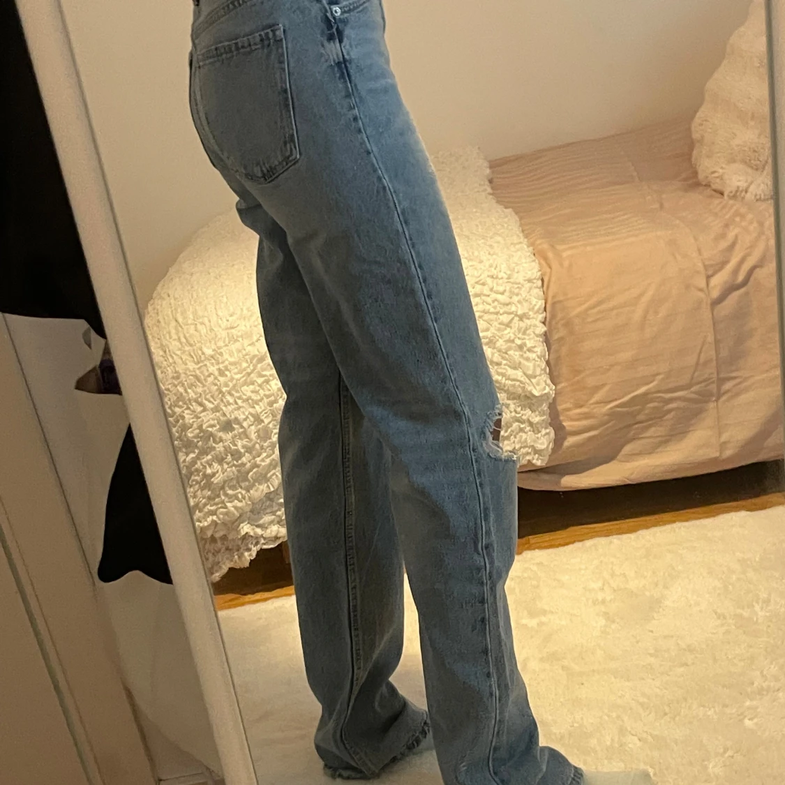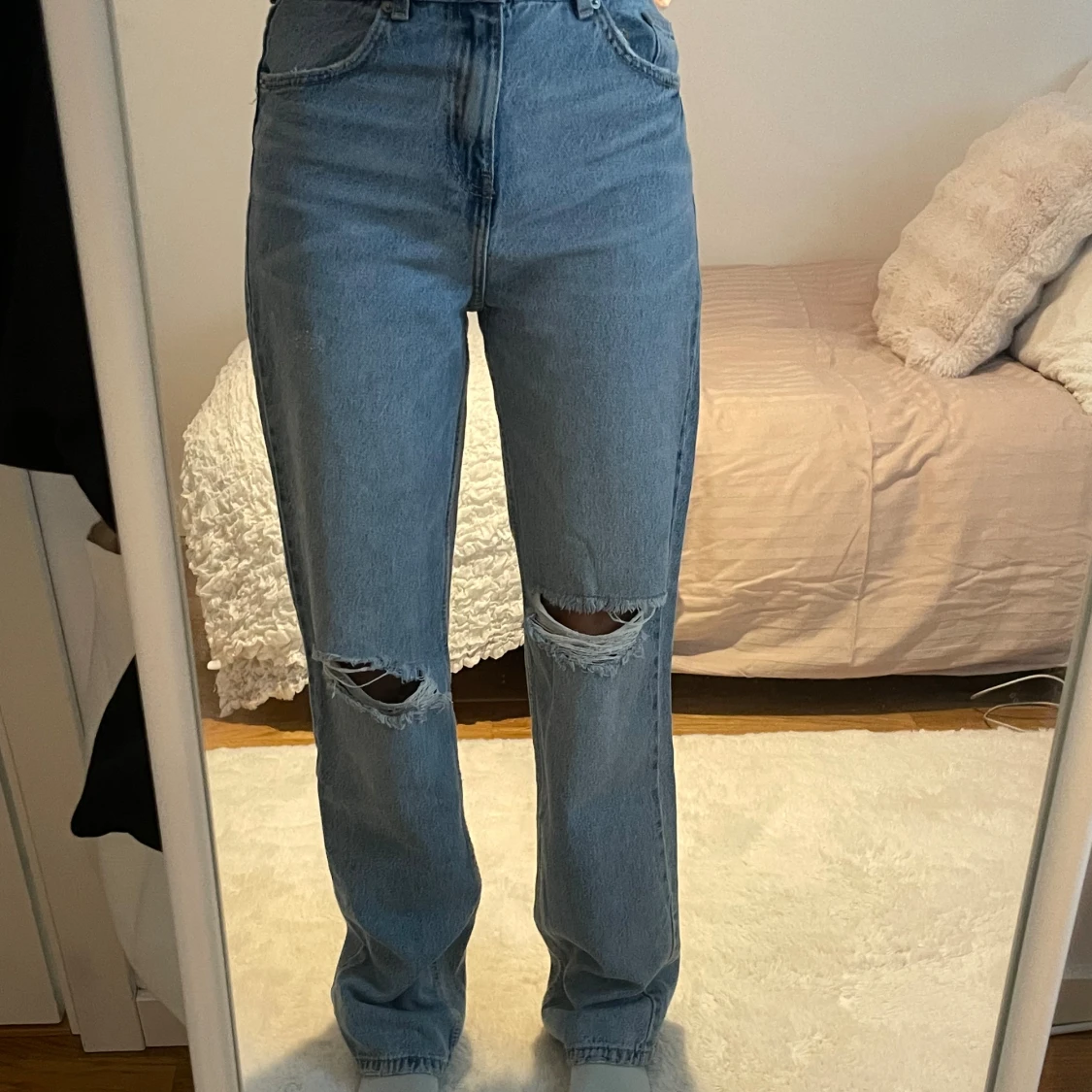 Säljer ett par ljusblå jeans med raka ben och snygga slitningar över båda knäna. Jeansen har hög midja och klassisk femficksdesign. Perfekta för en avslappnad och trendig look. Materialet är klassisk denim i bomull.