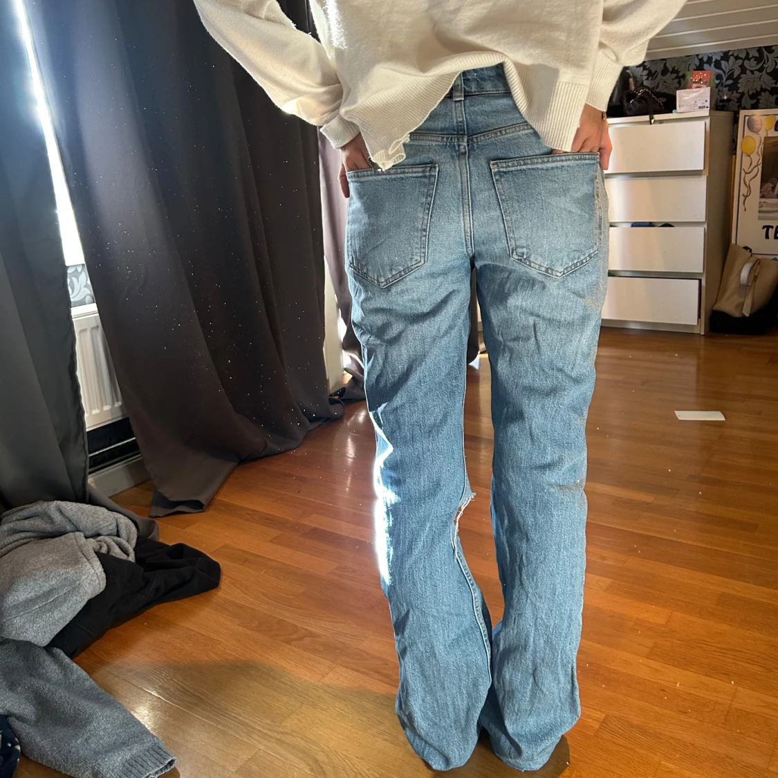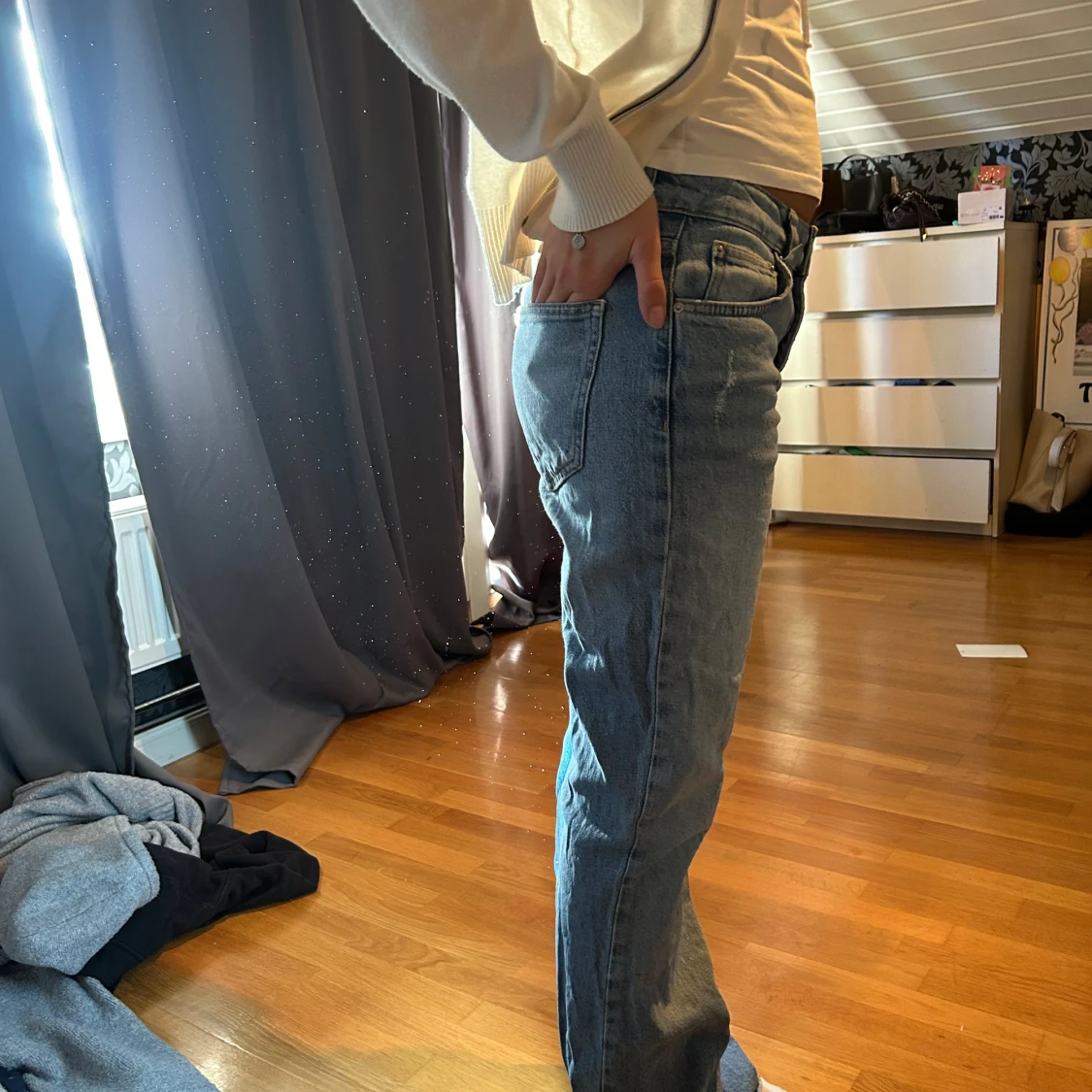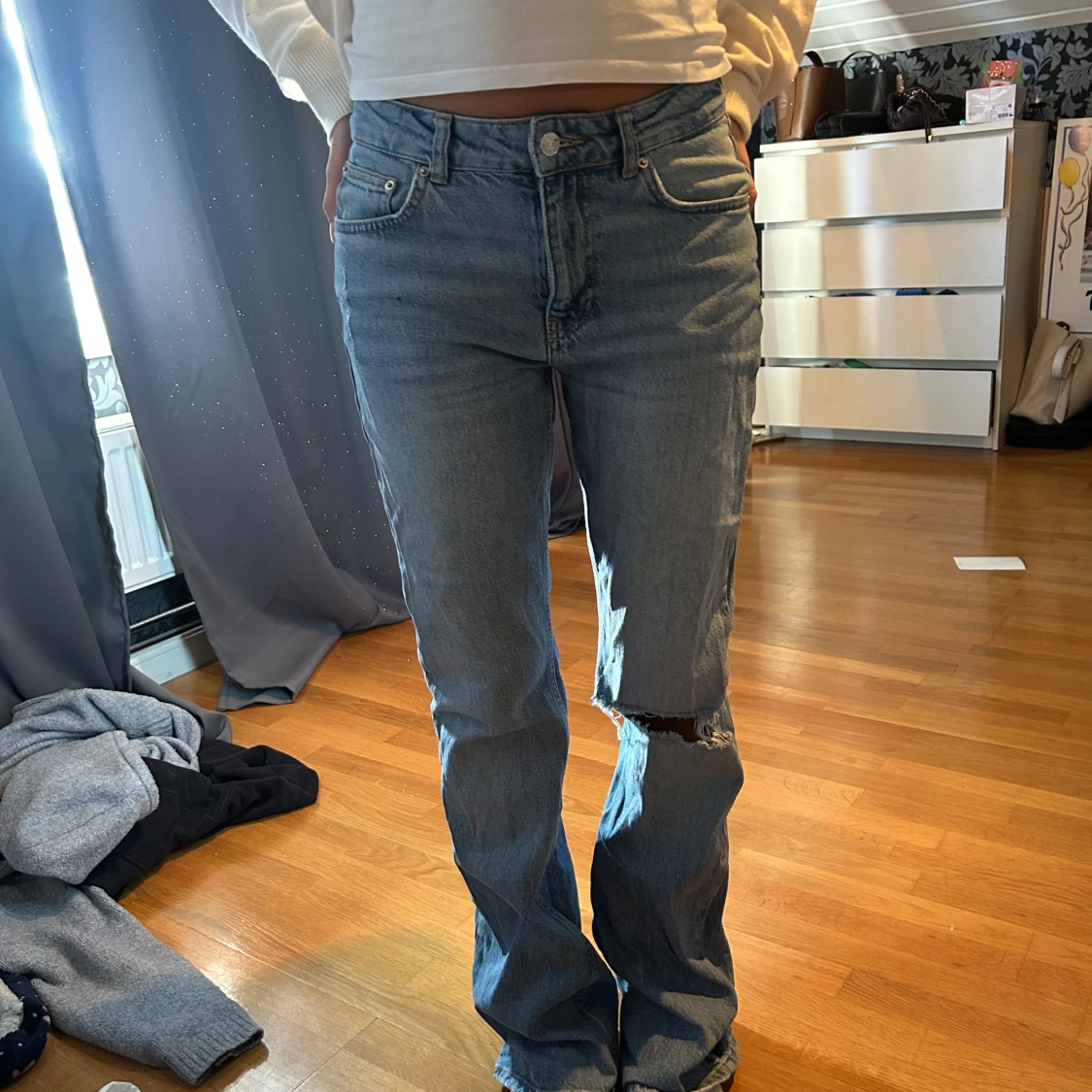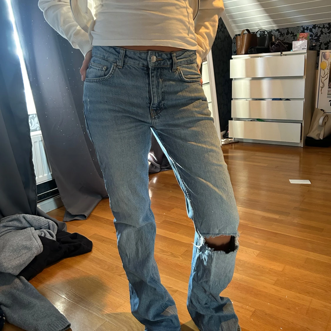 Säljer ett par ljusblå jeans med rak passform och klassisk femficksdesign. Jeansen har ett snyggt hål på ena knät för en trendig look. De är midwaist och tillverkade i jeansmaterial. Perfekta för dig som gillar en avslappnad och cool stil.
