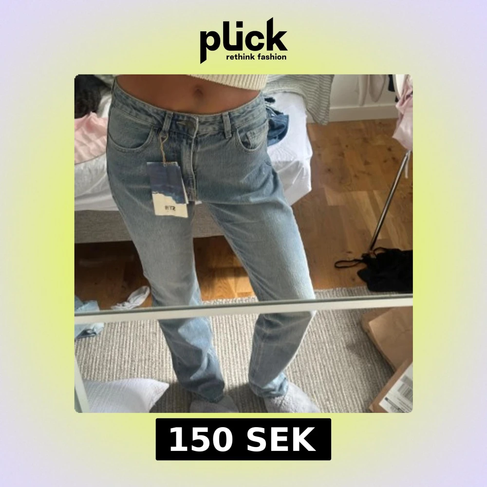 Säljer ett par ljusblå jeans med normal passform. Jeansen är bra längd för mig som är 163!