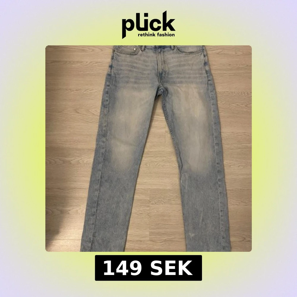 Säljer ett par ljusblå jeans med klassisk femficksdesign och raka ben. Jeansen har en något tvättad look och normal passform. Perfekta för en avslappnad stil och passar till det mesta i garderoben.