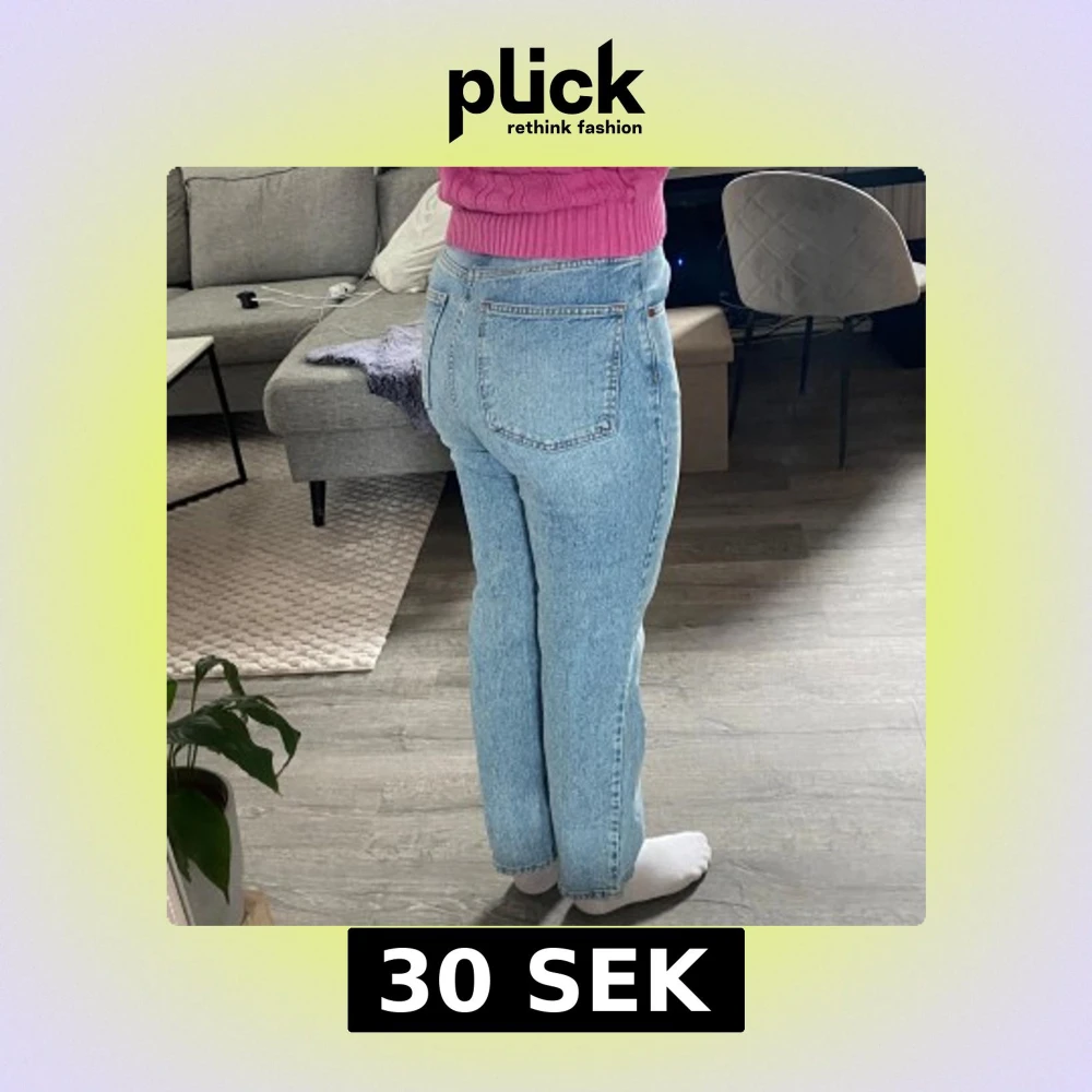 Säljer ett par ljusblå jeans med klassisk femficksdesign och raka ben. Jeansen har hög midja och stängs med dragkedja och knapp.
