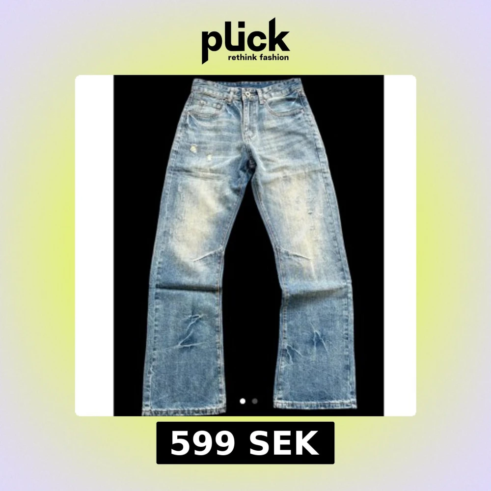 Säljer ett par jeans i ljusblå tvätt med slitna detaljer och lite mini bootcut passform. Jeansen har klassisk femficksdesign, knappgylf och är tillverkade i robust denim. Perfekt för dig som gillar vintagekänsla och bredare ben. Storlek 32/32 men sitter lite mindre i midjan enligt mig