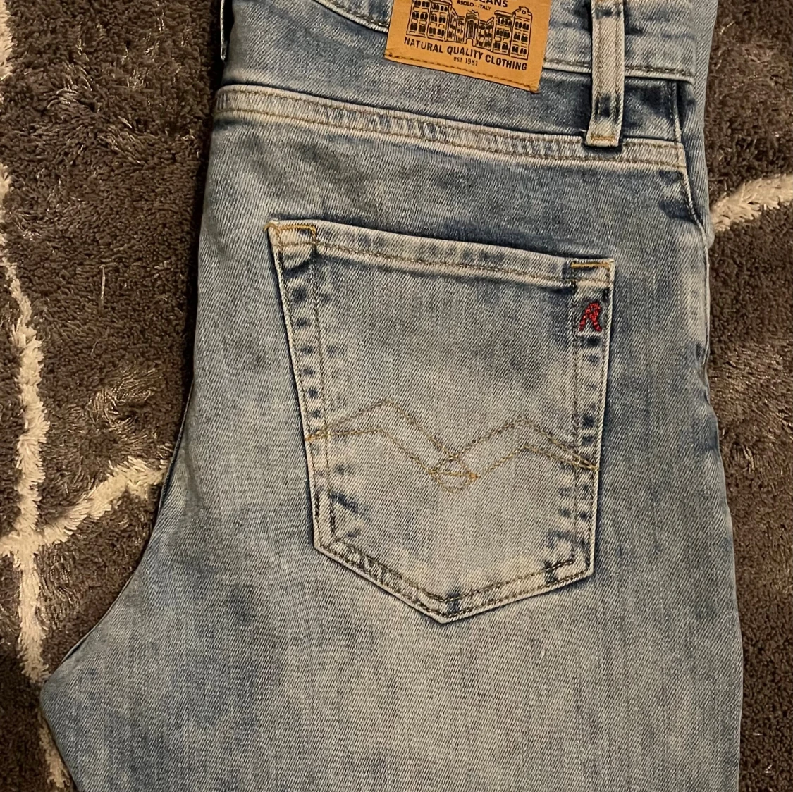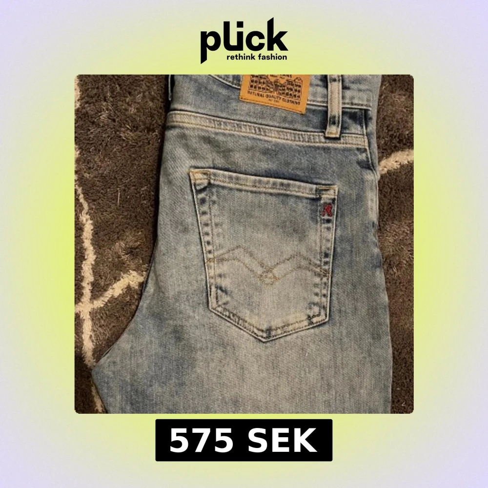Säljer ett par ljusblå jeans från Replay med klassisk femficksdesign, snygga detaljer på bakfickorna och läderpatch i midjan. Jeansen har rak passform och dragkedja i gylfen. Perfekta för dig som gillar en avslappnad stil.