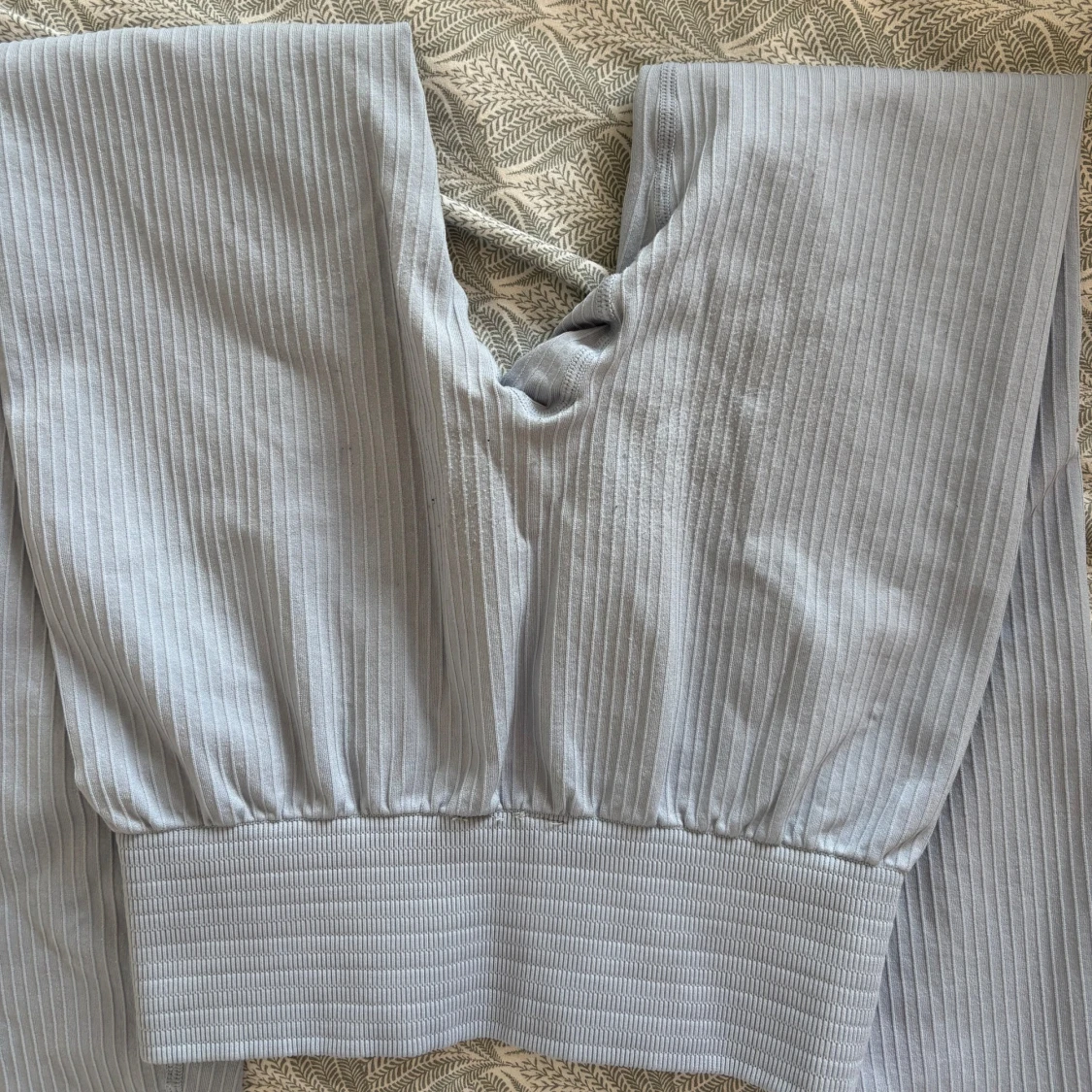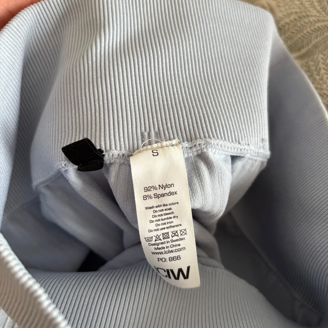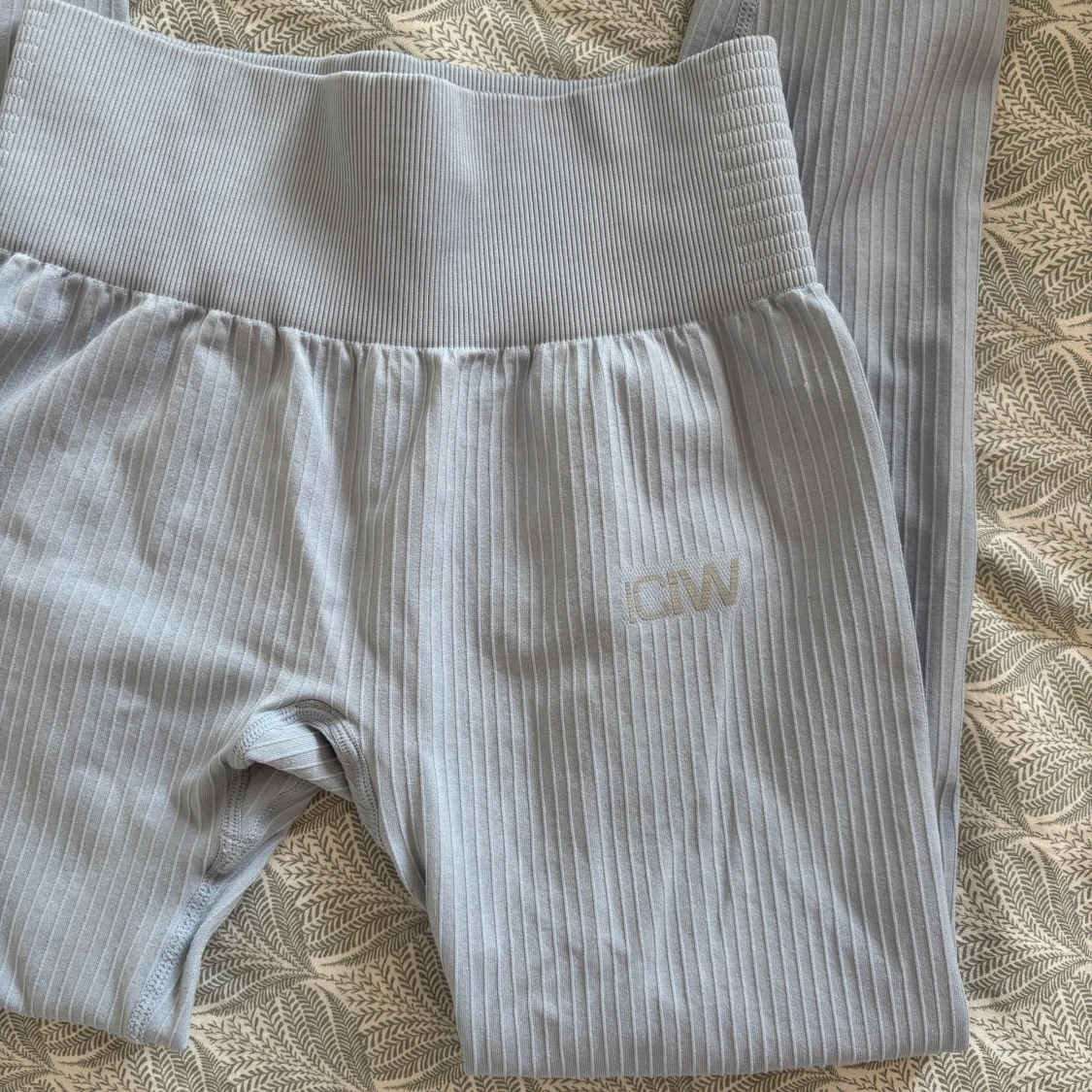 Supersnygga ljusblå ribbade tights från ICANIWILL med hög midja och seamless design. Perfekta för träning eller chill, med stretchigt material och bred resår i midjan för extra komfort. Diskret logga framtill. Byxorna är köpta här på plick men har tyvärr inte kommit till användning. De är något noppriga på baken, men inget man direkt ser när de sitter på!