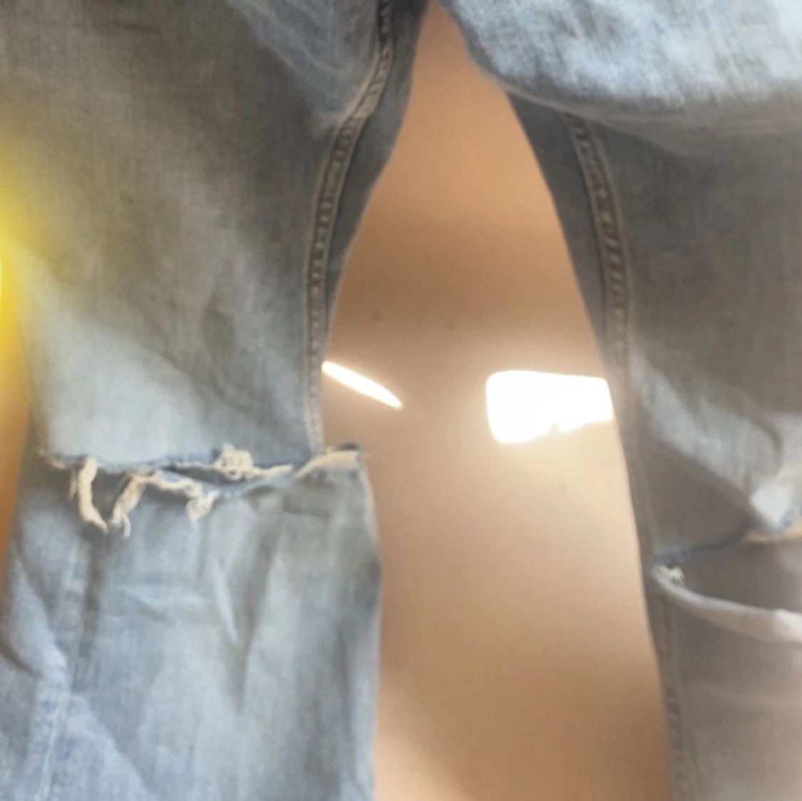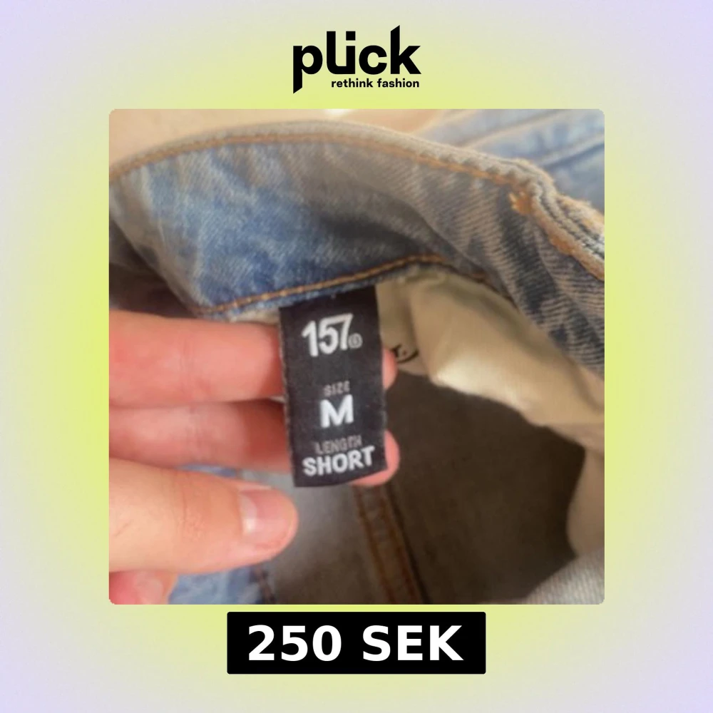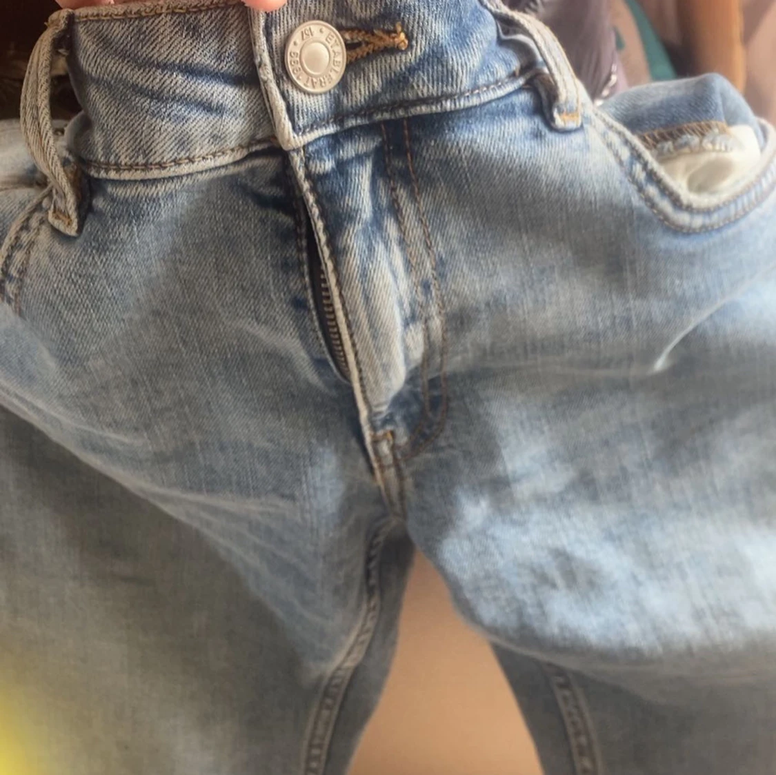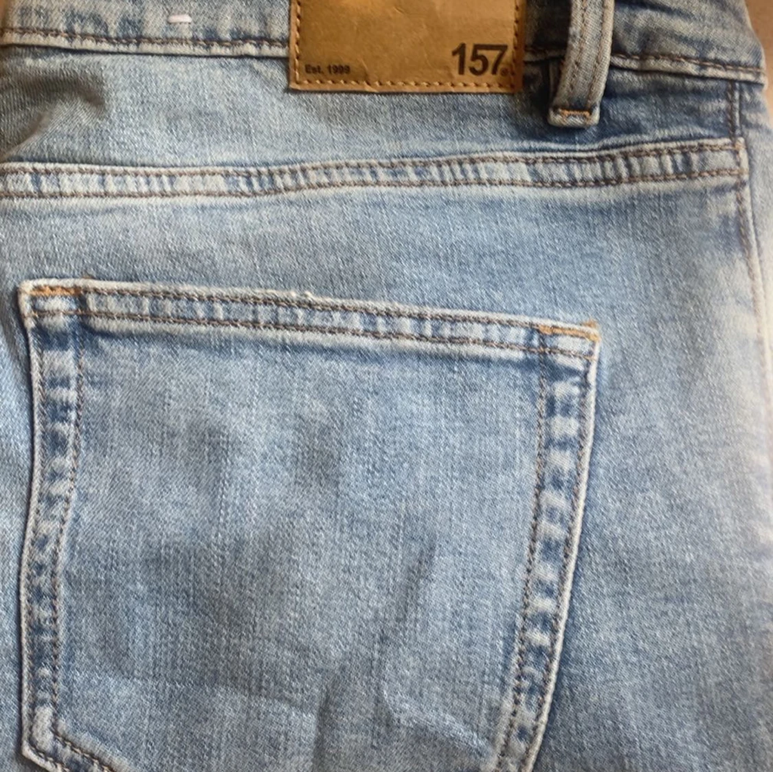 Säljer ett par ljusblå jeans från 157 i storlek M, short längd. Jeansen har klassisk femficksdesign, dragkedja och knapp framtill samt slitna detaljer och hål vid knäna för en cool, avslappnad look. Provade en gång.