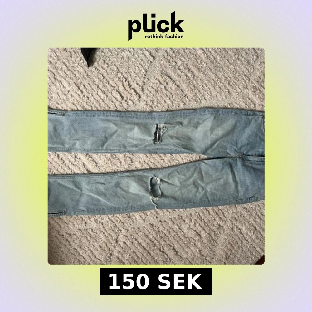 Säljer ett par ljusblå jeans från Zara med slitna detaljer och hål på båda benen.