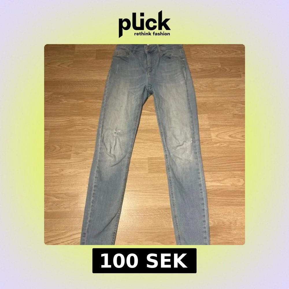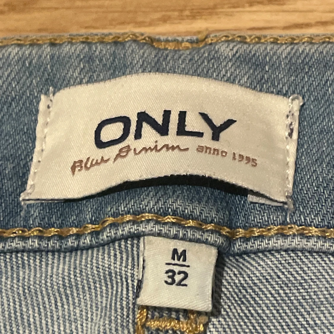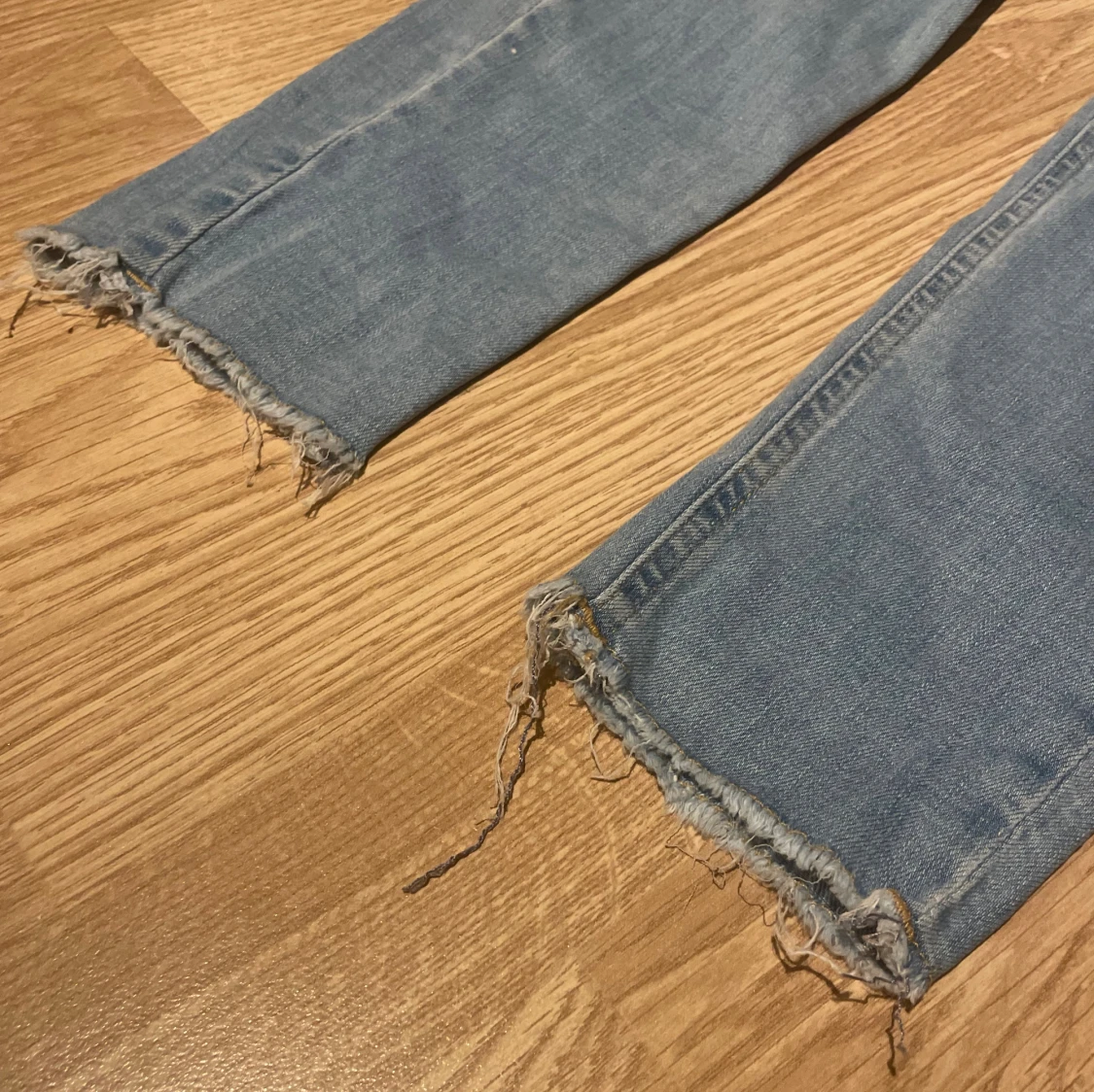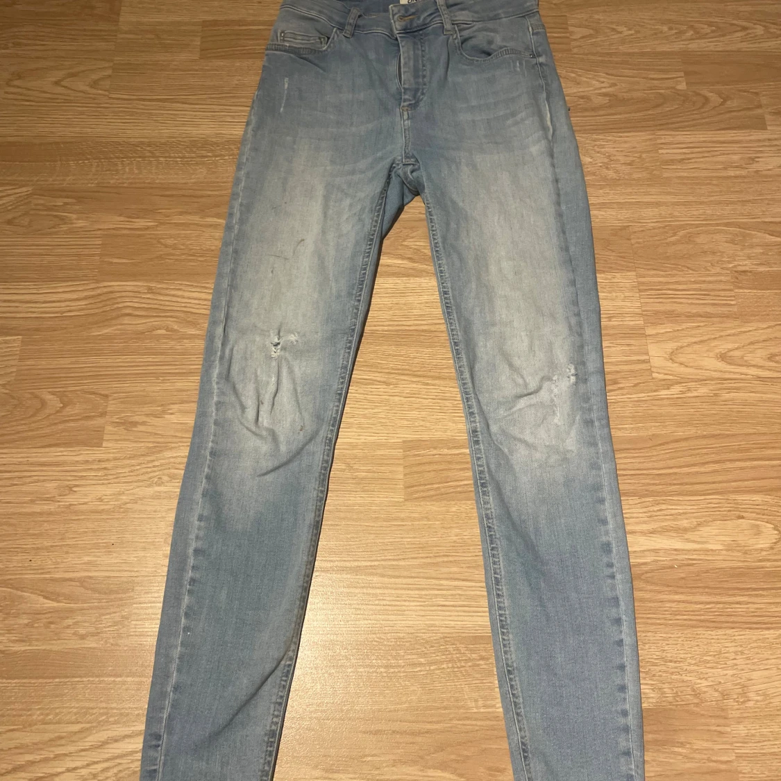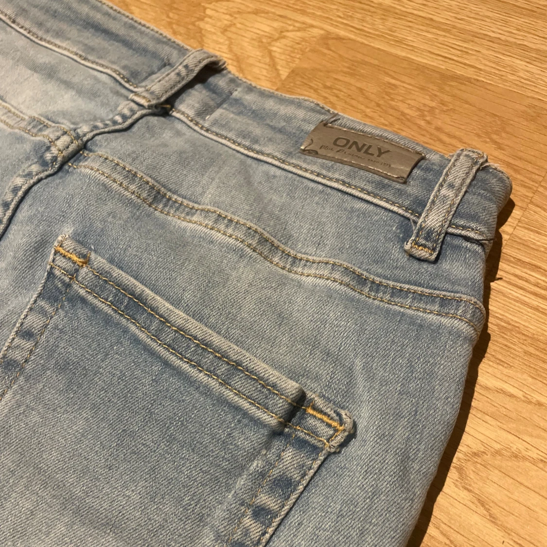 Säljer ett par ljusblå skinny jeans från ONLY med hög midja och slitna, fransiga benslut. Storlek M/32