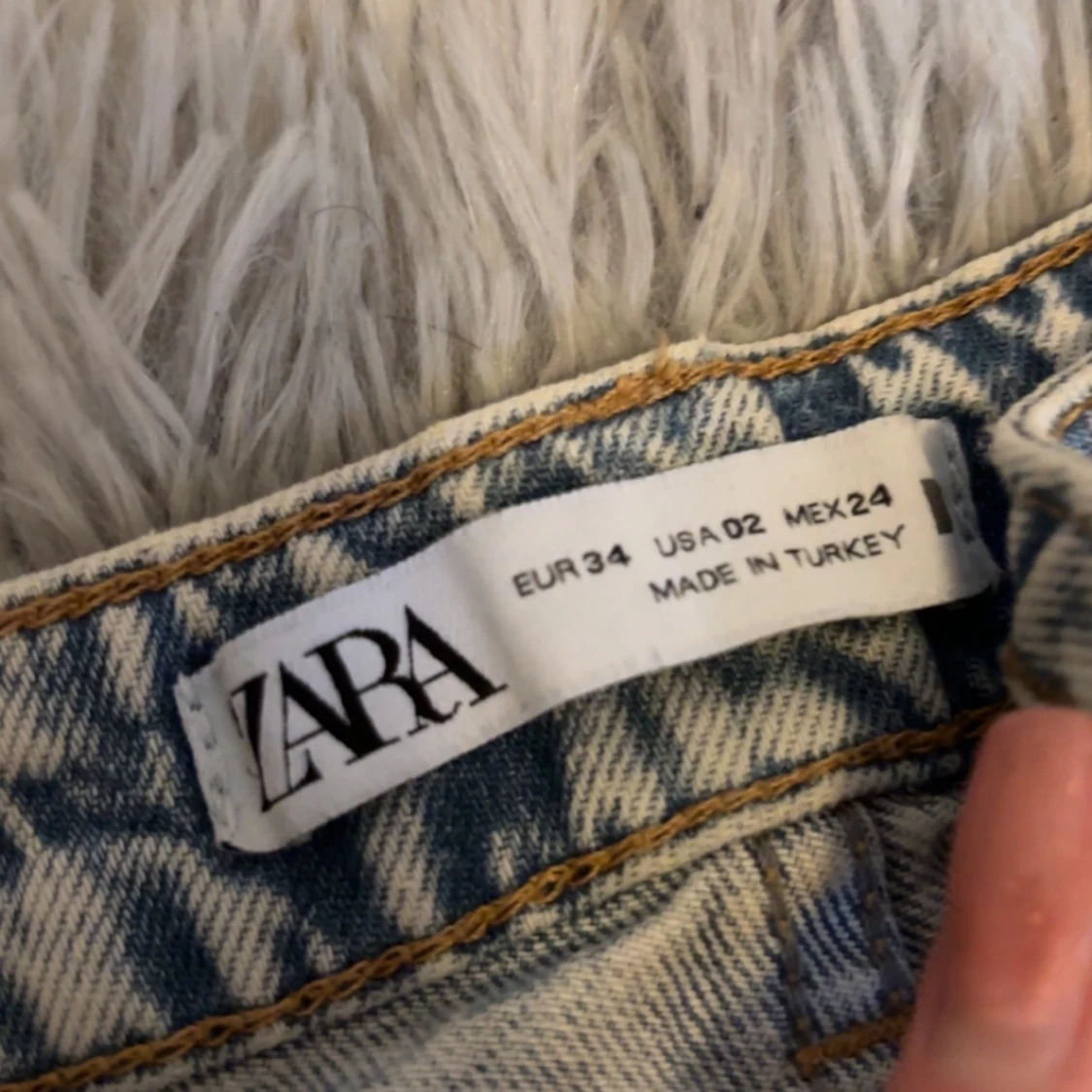 Ljusblå boot cut jeans från Zara med kraftiga slitningar och hål på benen. Dem har en slits i sluter samt en passform och klassisk femficksdesign. Perfekta för en avslappnad och trendig look.Passar till en lång tjej💕💕
