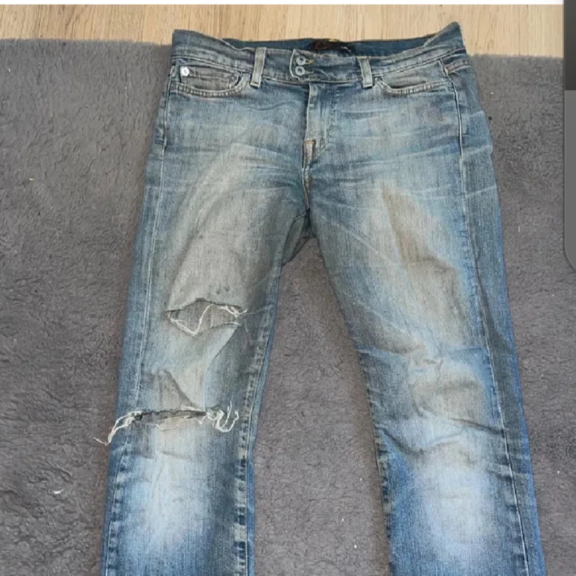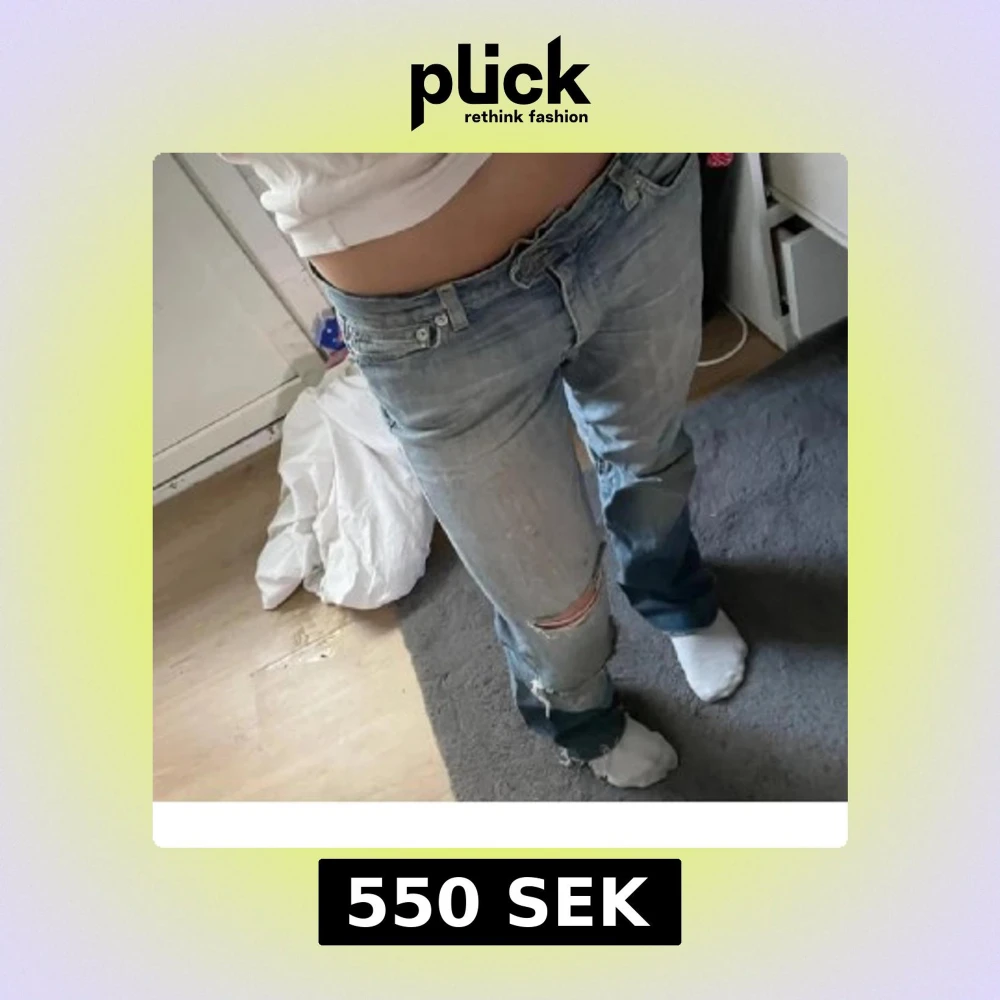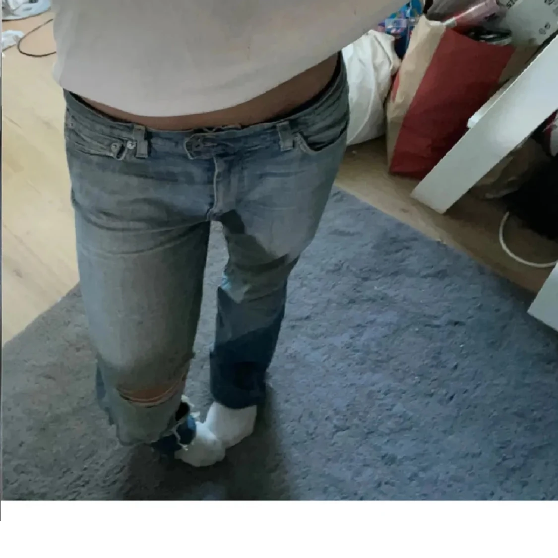 Säljer ett par ljusblå jeans med slitningar och hål på ena knät. Bilder från tidigare ägare då de var för korta på mig som är 165🥰 passar om man är 155 typ
