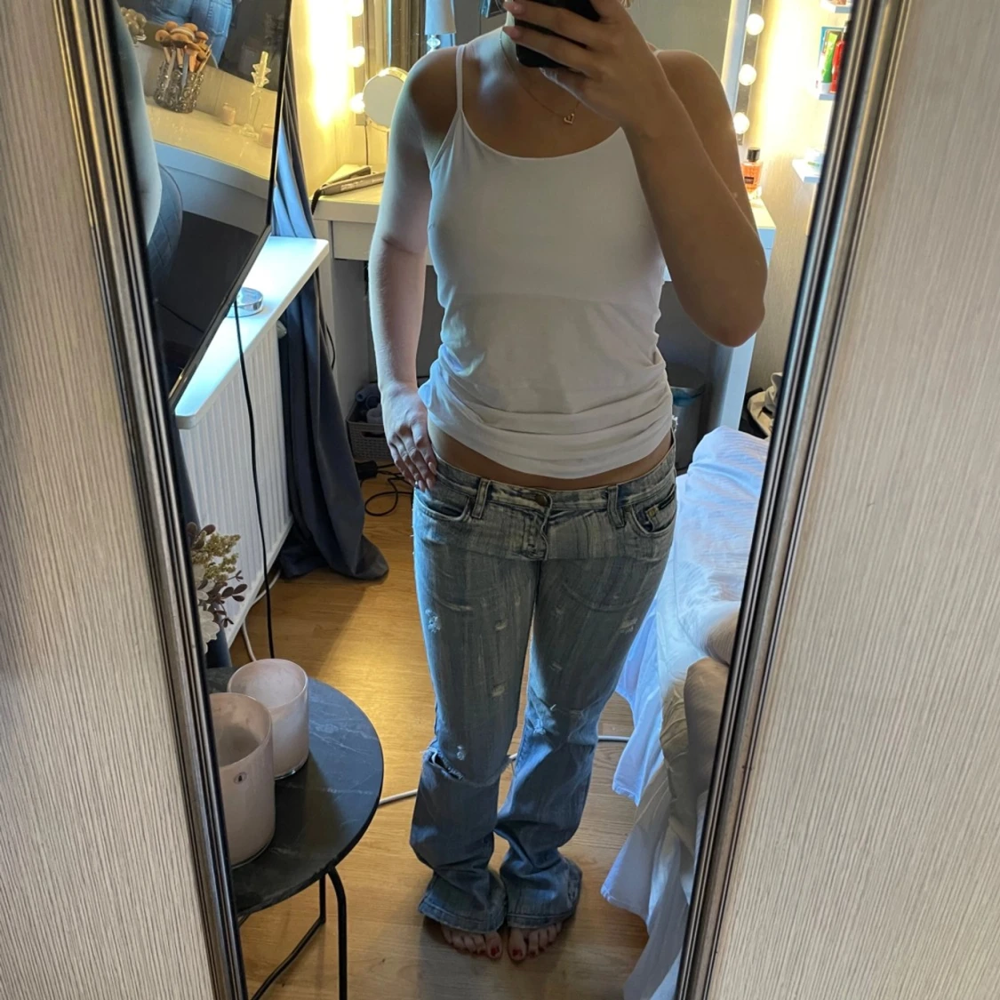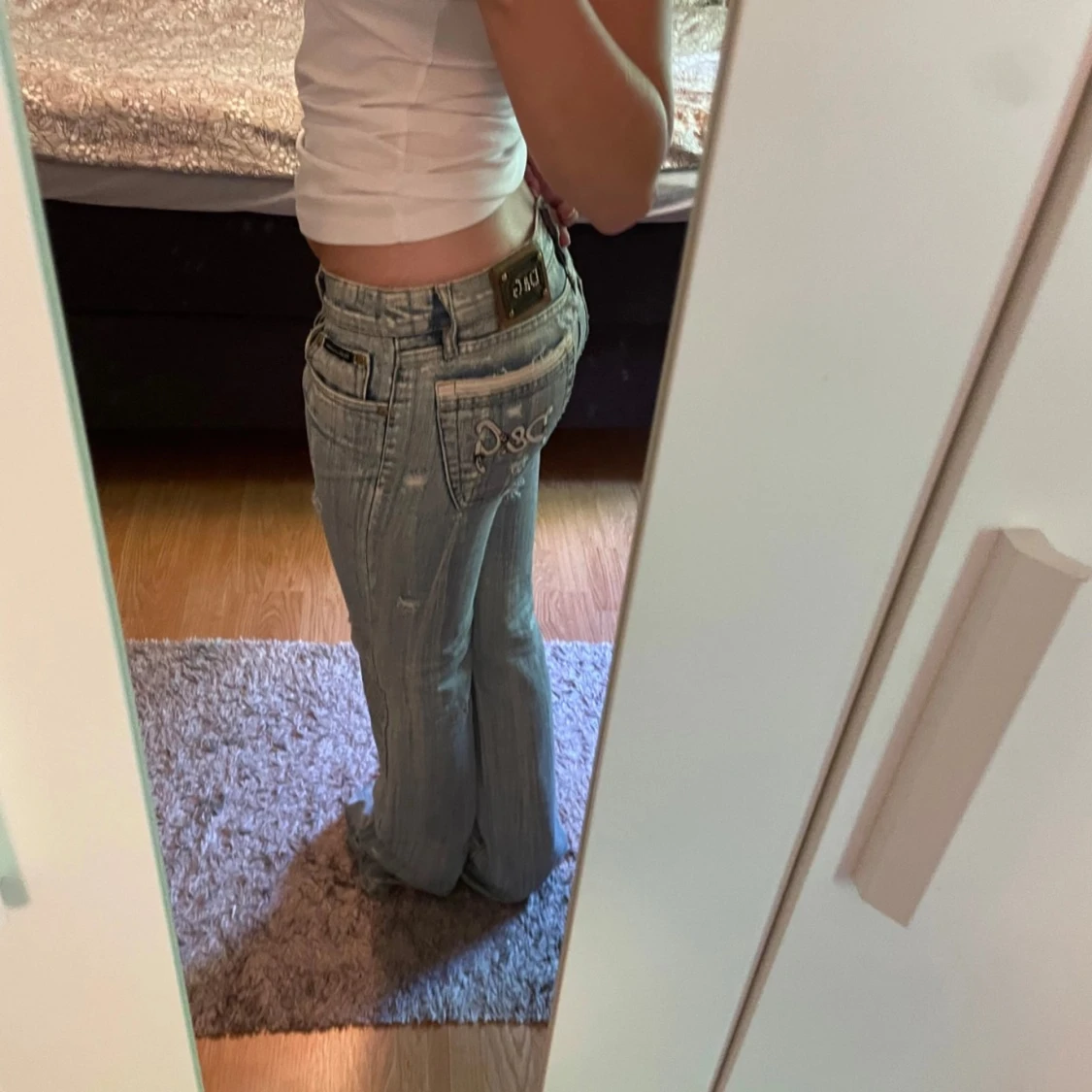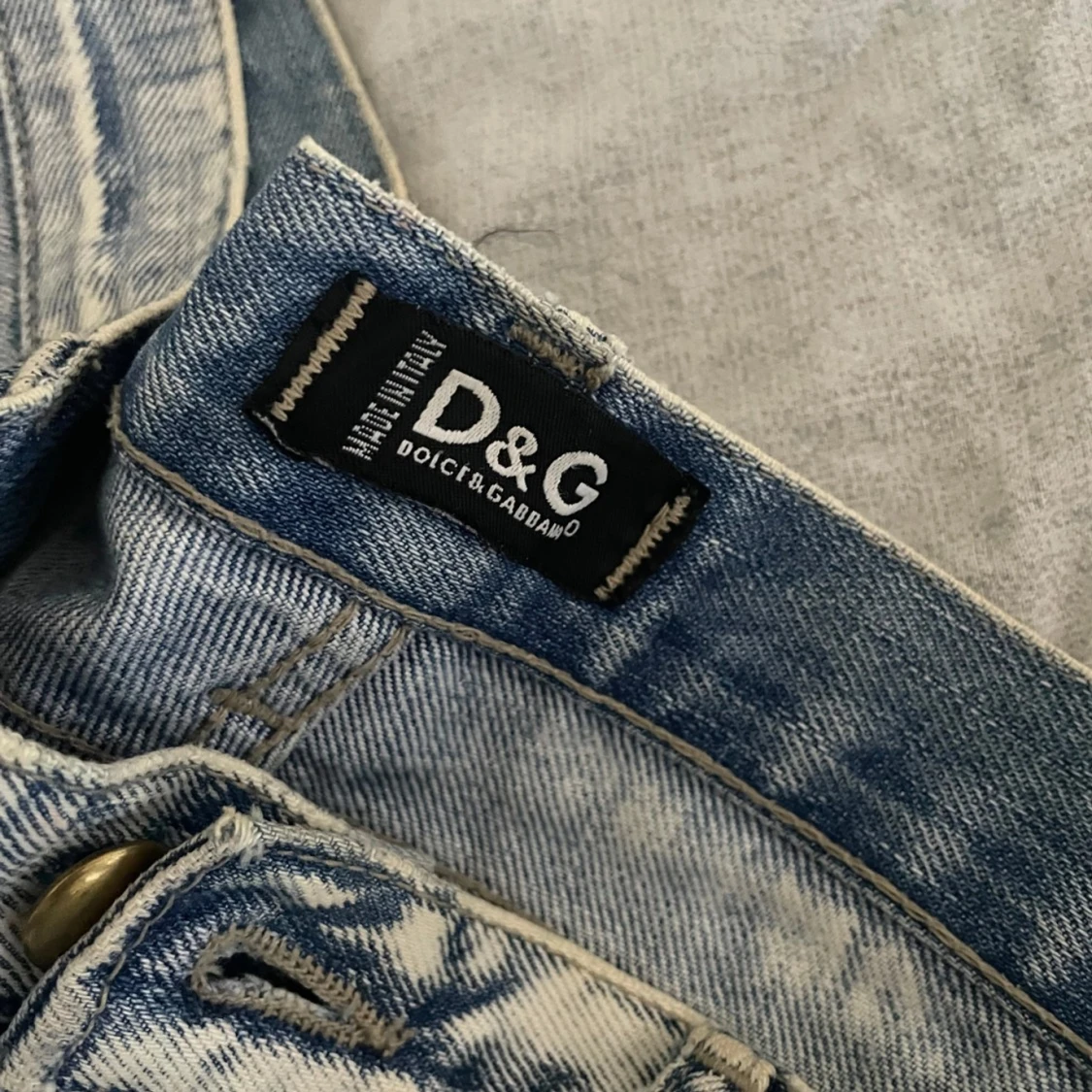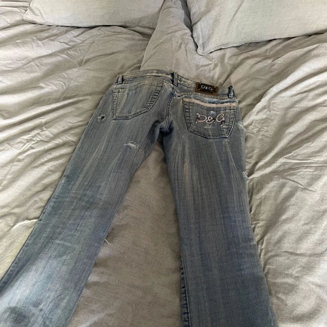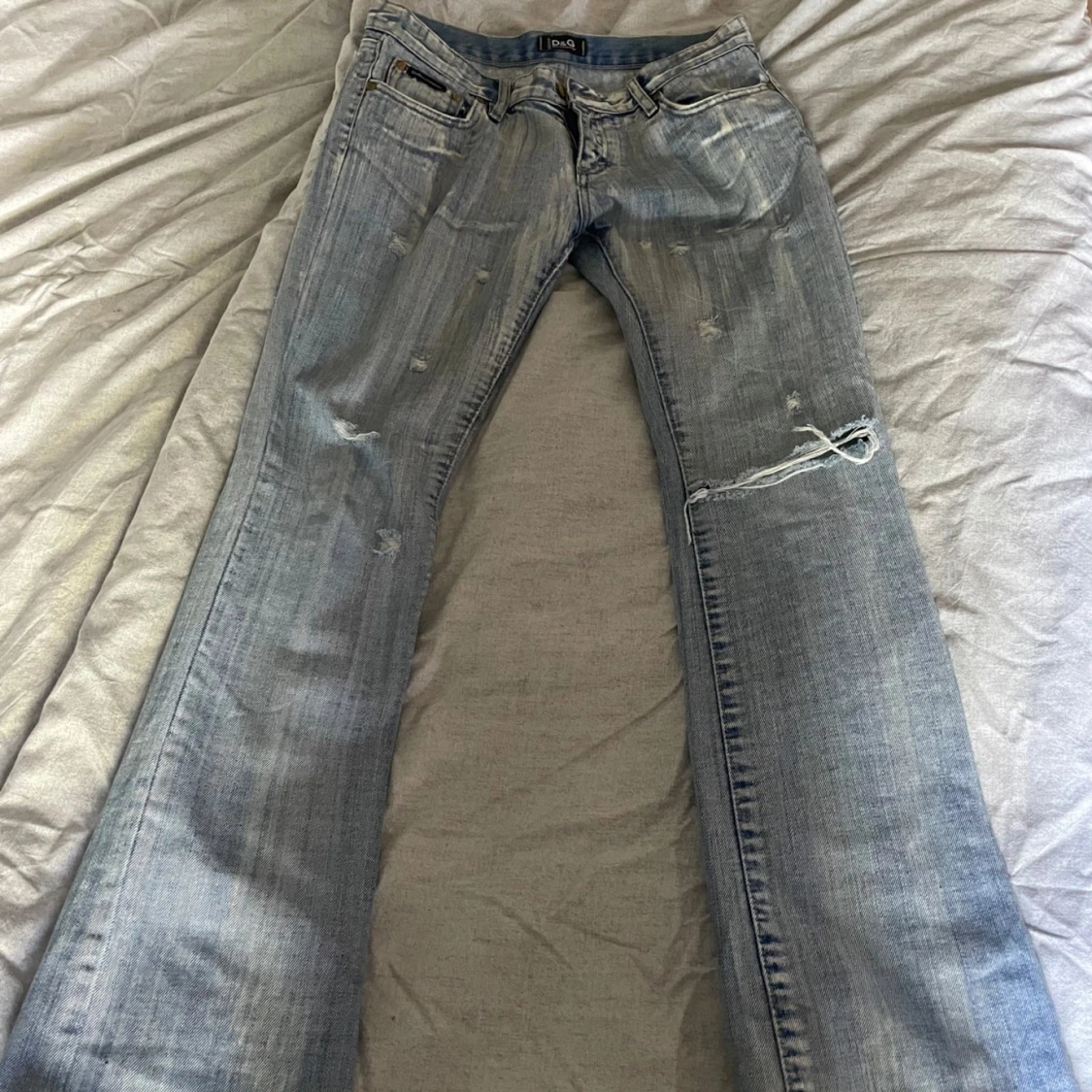Säljer ett par ljusblå jeans från D&G med slitningar och trasiga detaljer, särskilt vid knät. Klassisk femficksmodell med broderad logga på bakfickan. Jeansen har raka ben och är tillverkade i denim med en snygg tvättad look.
