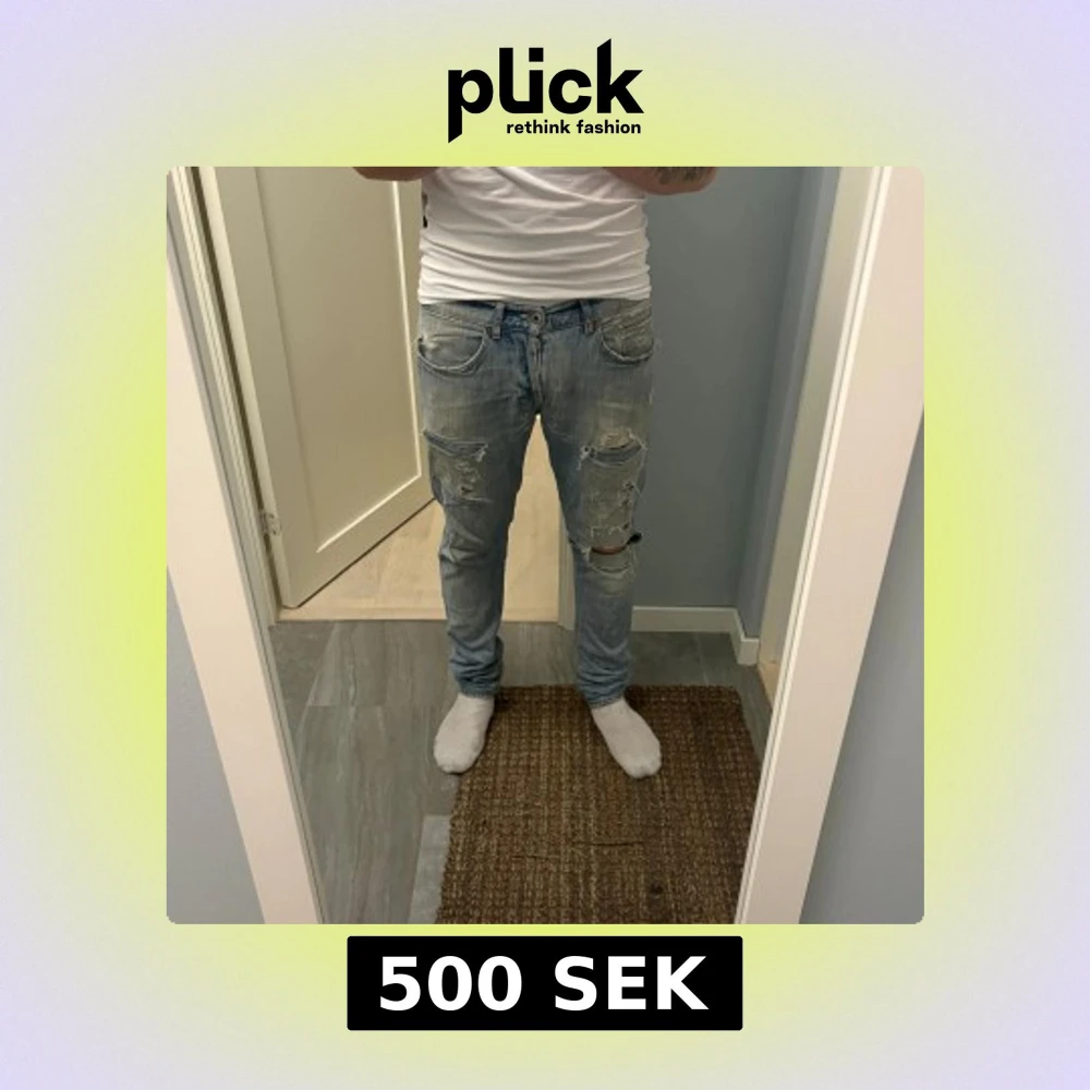 Säljer ett par ljusblå jeans från Dondup med rejält slitna detaljer och hål på både fram- och baksida. Jeansen har klassisk femficksdesign, skinny passform och är tillverkade i jeansmaterial. Perfekta för dig som gillar en edgy och avslappnad stil.