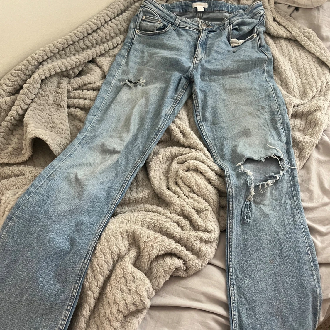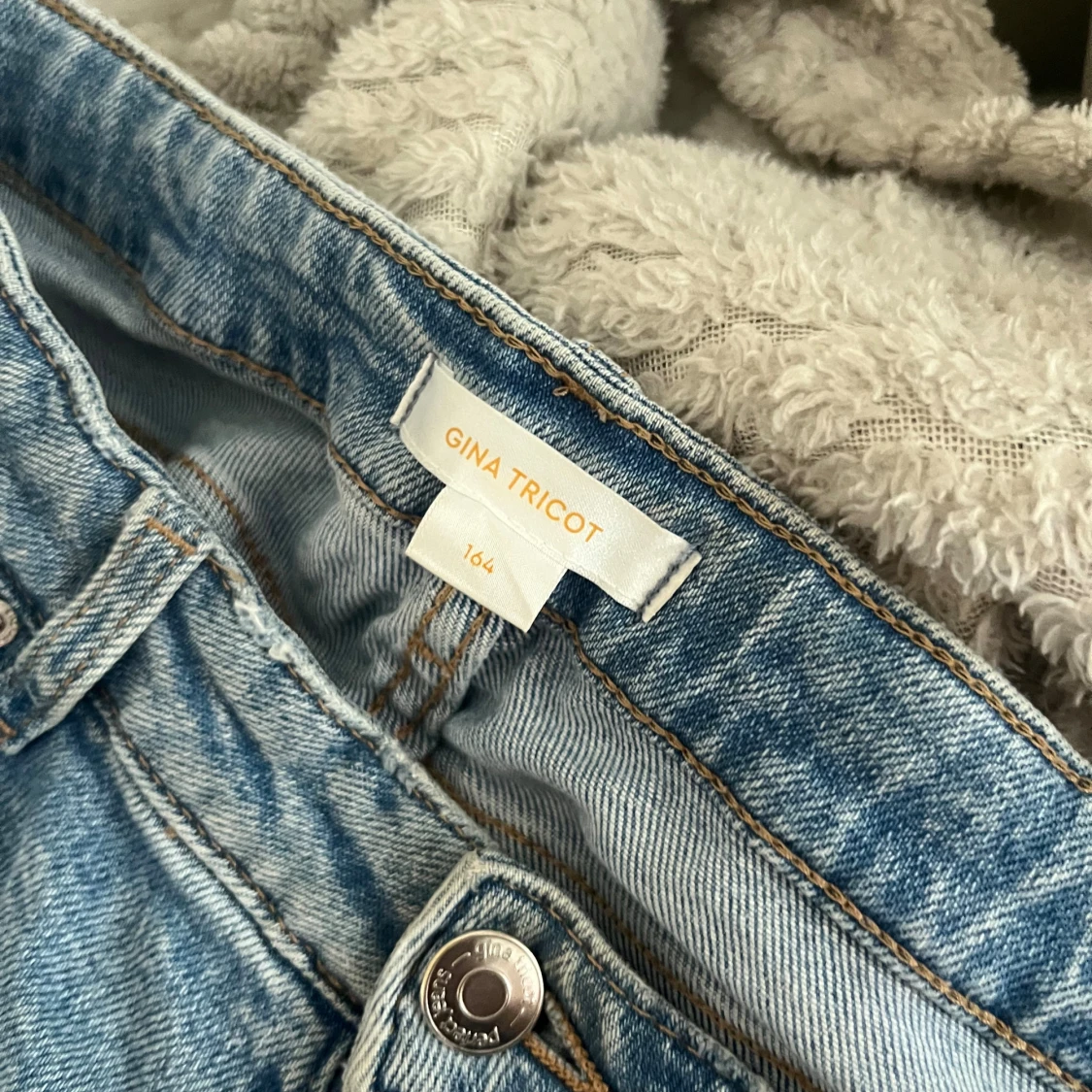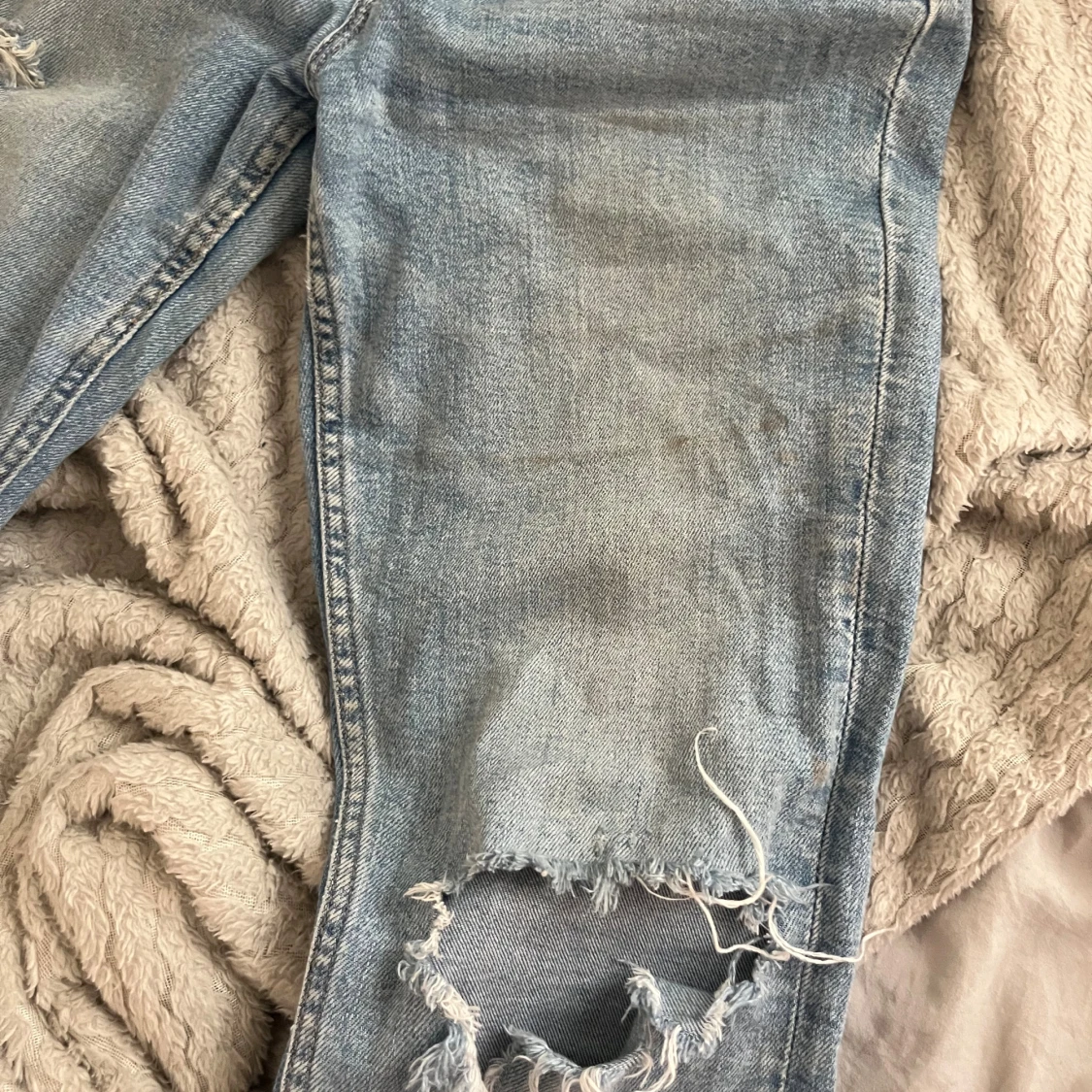 Ljusblå jeans från Gina Tricot med snygga slitningar och hål på benen. Slitna där nere och lite smink ränder på låret men annars fint skick! Storlek 164 men passar mig som är 167 och brukar ha s! Kom privat för fler bilder då man max kunde ladda upp 5🥰