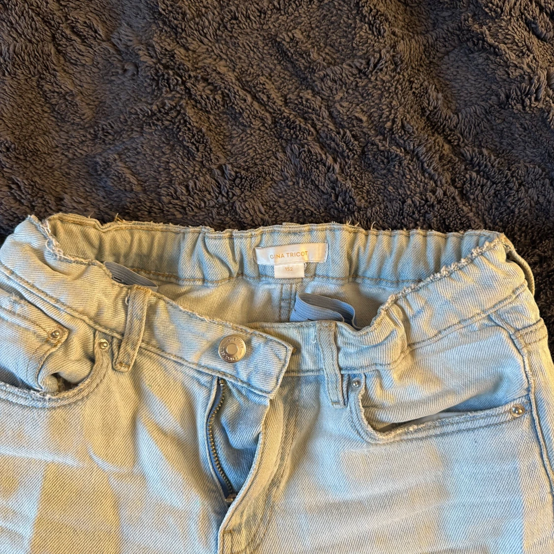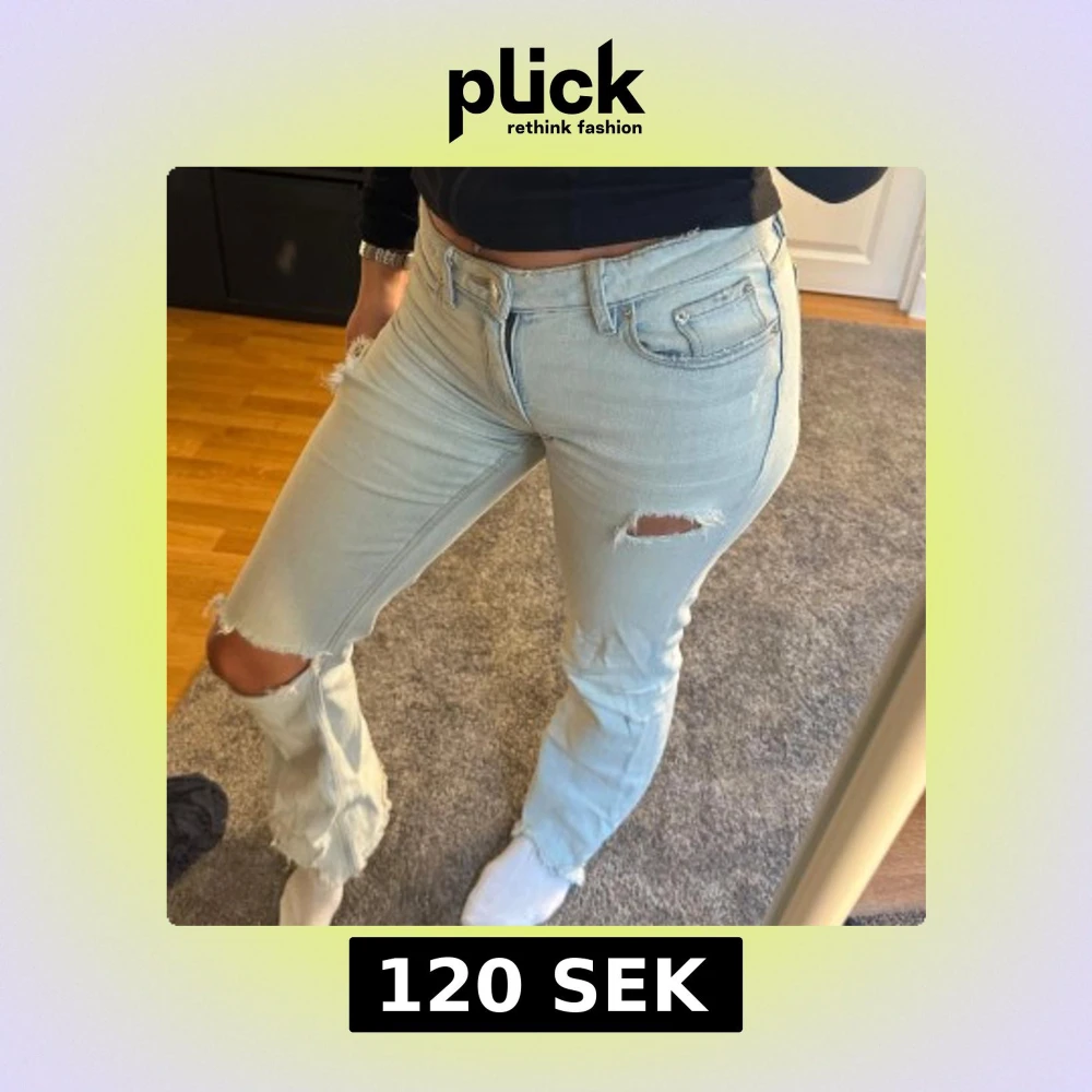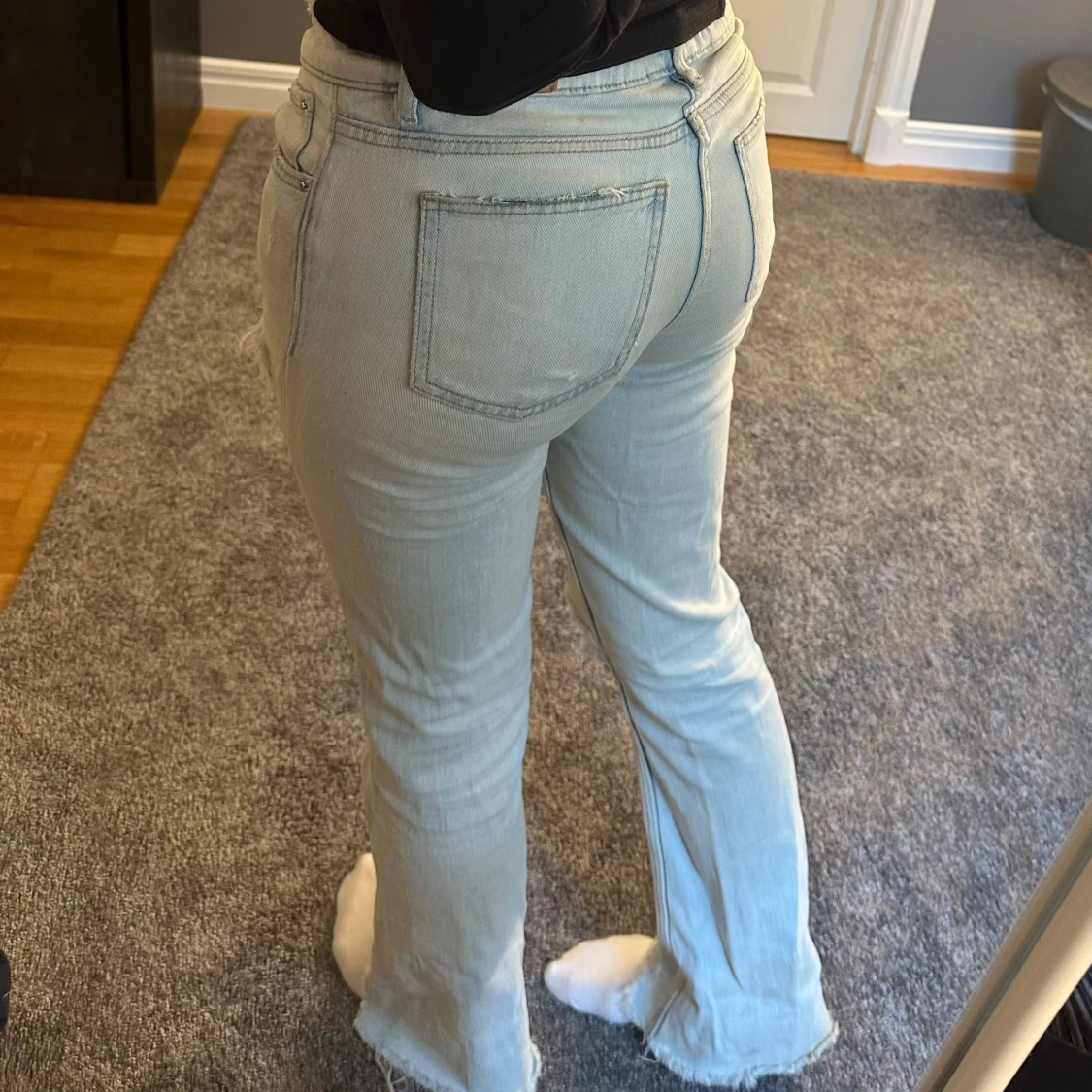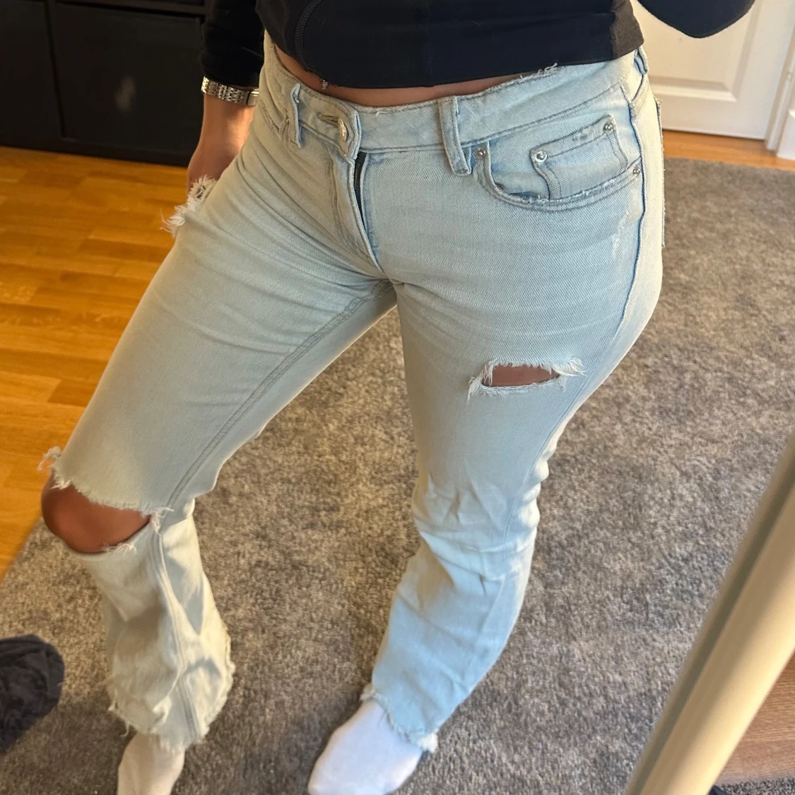 Säljer ett par ljusblå jeans från Gina Tricot med snygga slitningar på knäna och fransiga benslut. Jeansen har klassisk femficksmodell, normal passform och dragkedja. Perfekta för dig som gillar en avslappnad och trendig look.