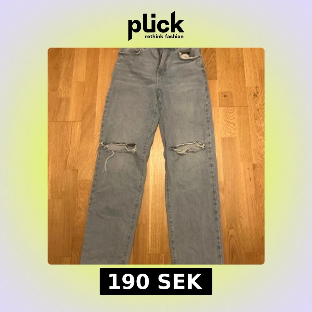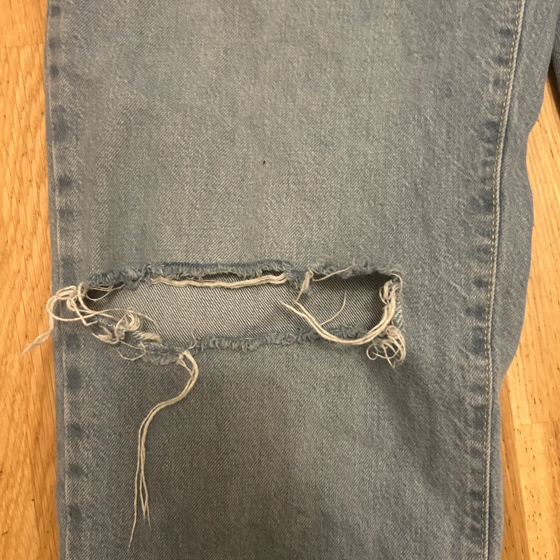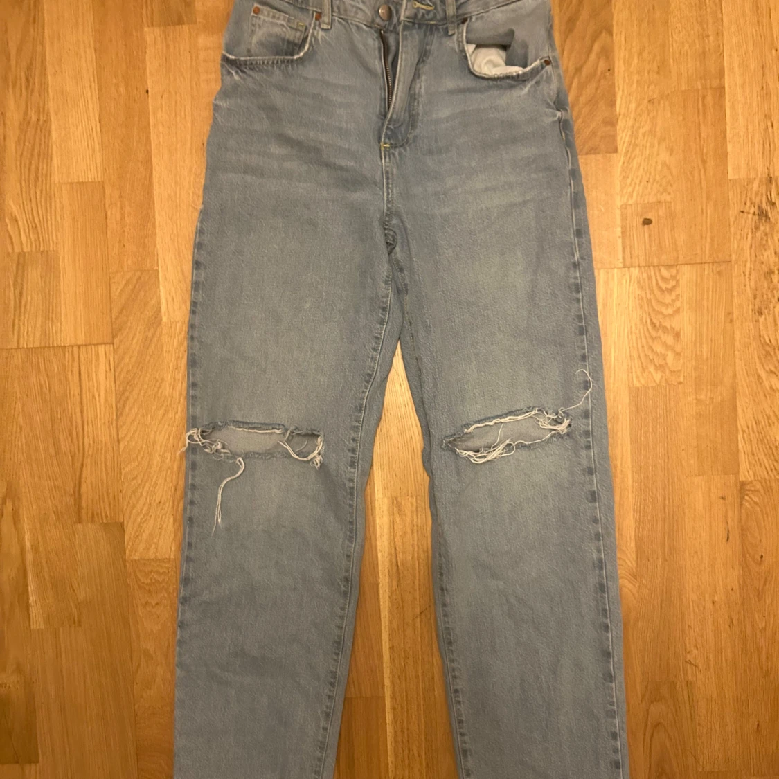 Ljusblå jeans med raka ben och snygga slitningar över båda knäna. Jeansen har klassisk femficksdesign och är tillverkade i robust denim. Perfekta för en avslappnad och trendig look.