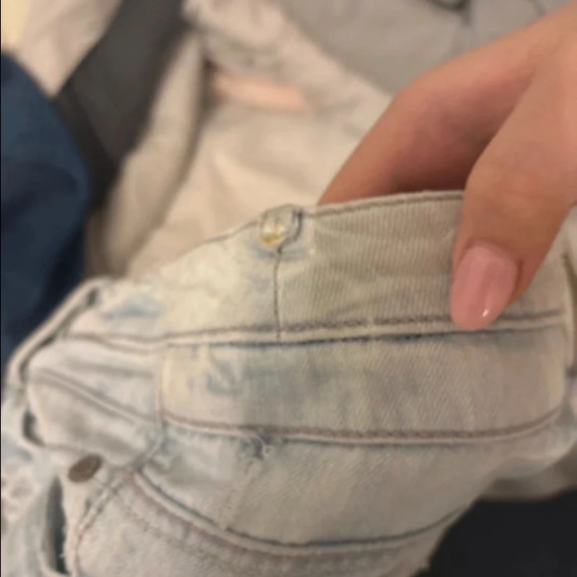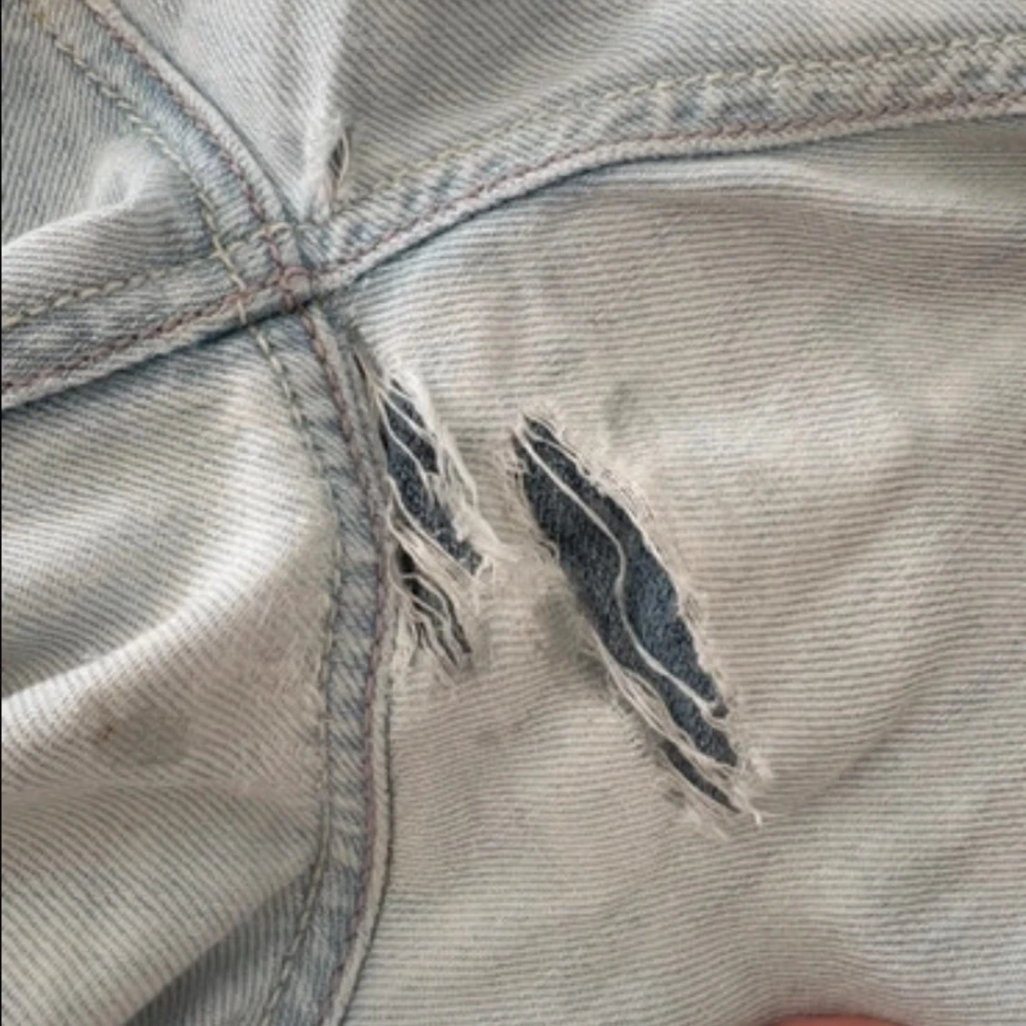 Säljer ett par ljusblå jeans med bootcut passform och flera slitningar och hål för en riktigt edgy look. Jeansen har låg midja och klassisk femficksdesign. Perfekta för dig som gillar en avslappnad och trendig stil. Midja 37 innerben 79