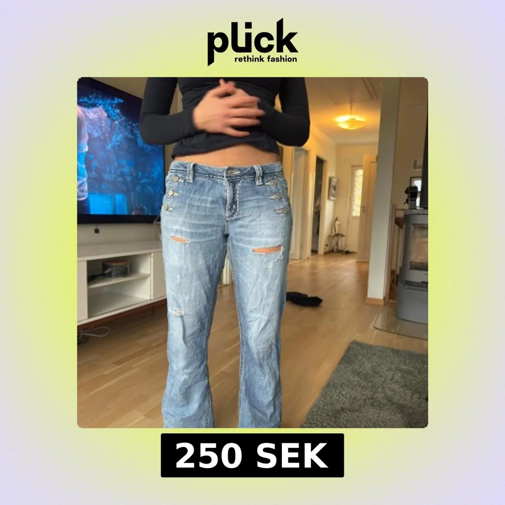 Säljer ett par ljusblå jeans med flera dekorativa knappar vid fickorna och slitna detaljer framtill. Jeansen har raka ben och klassiska bakfickor med lock. Perfekta för en avslappnad och trendig look. rätt slitna, se sista bilden