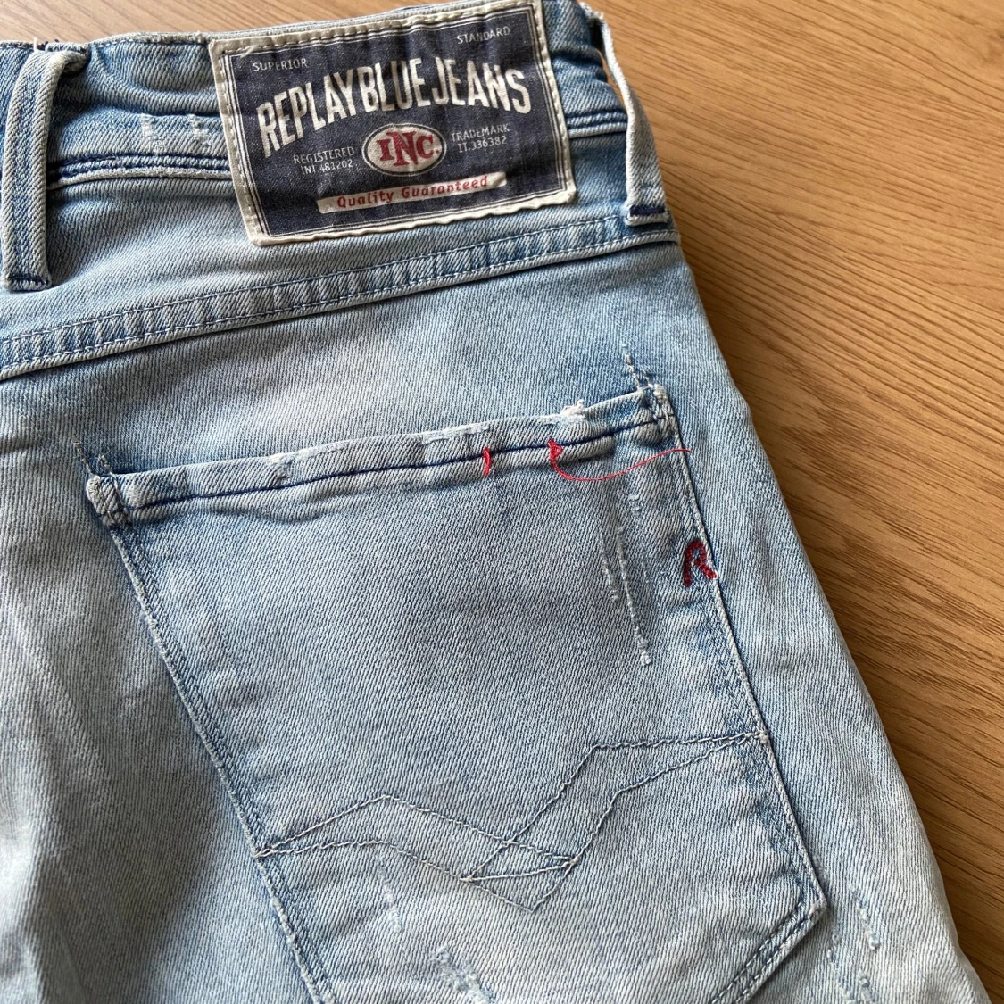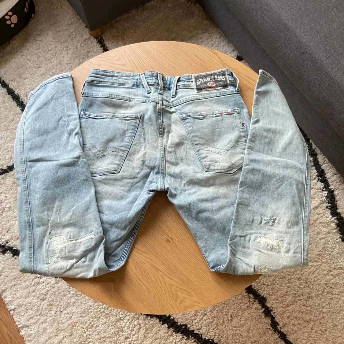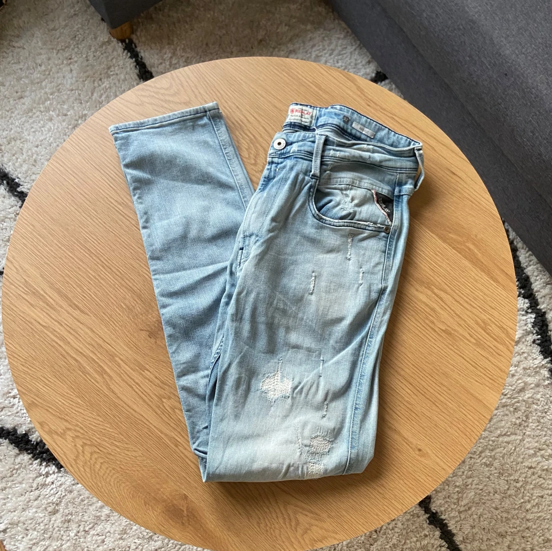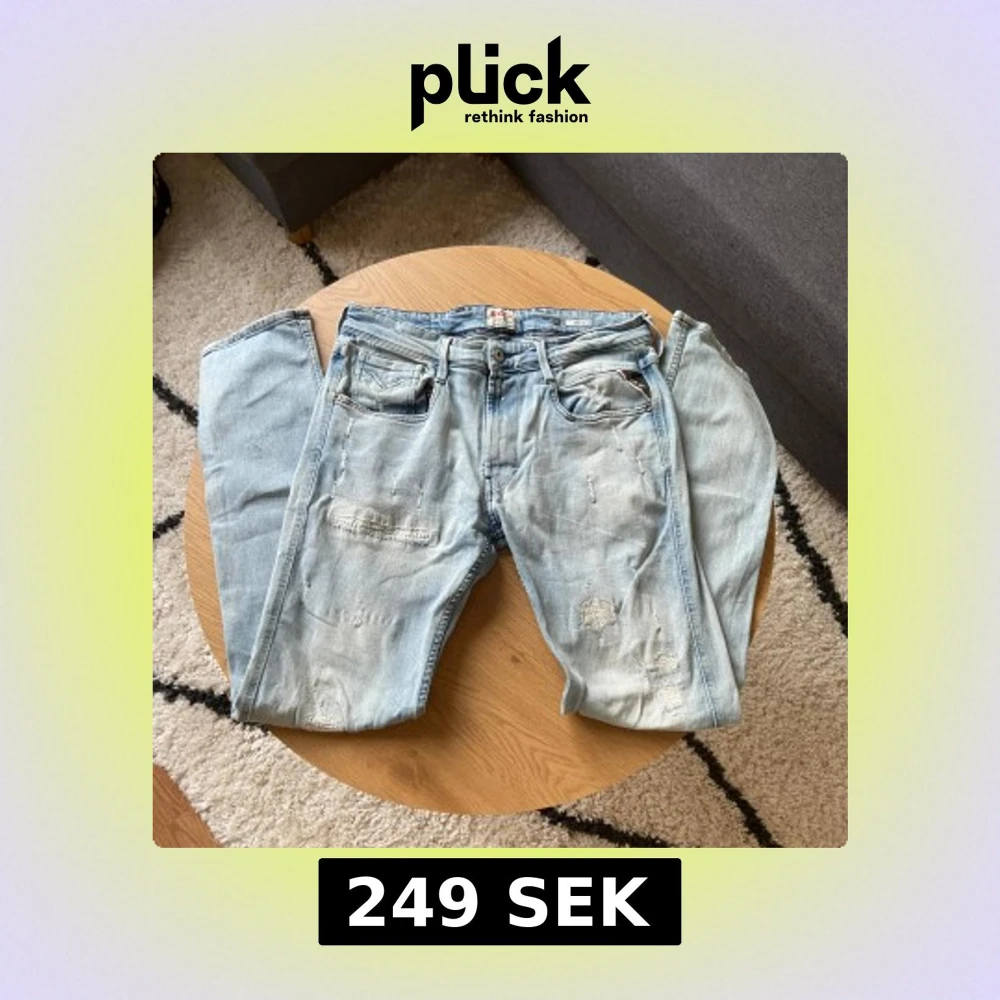 Hallå hallå👋 Säljer ett par ljusblå jeans från Replay med slitningar och lagade detaljer på benen i Anbass modell👖 Klassisk femficksmodell med normal passform och dragkedja. Perfekta för en avslappnad och enkel stil😮💨 Storleken är W32 L32📏 Priset kan diskuteras vid snabb affär!💸 Vid frågor: Meddela📩