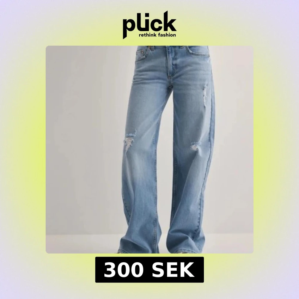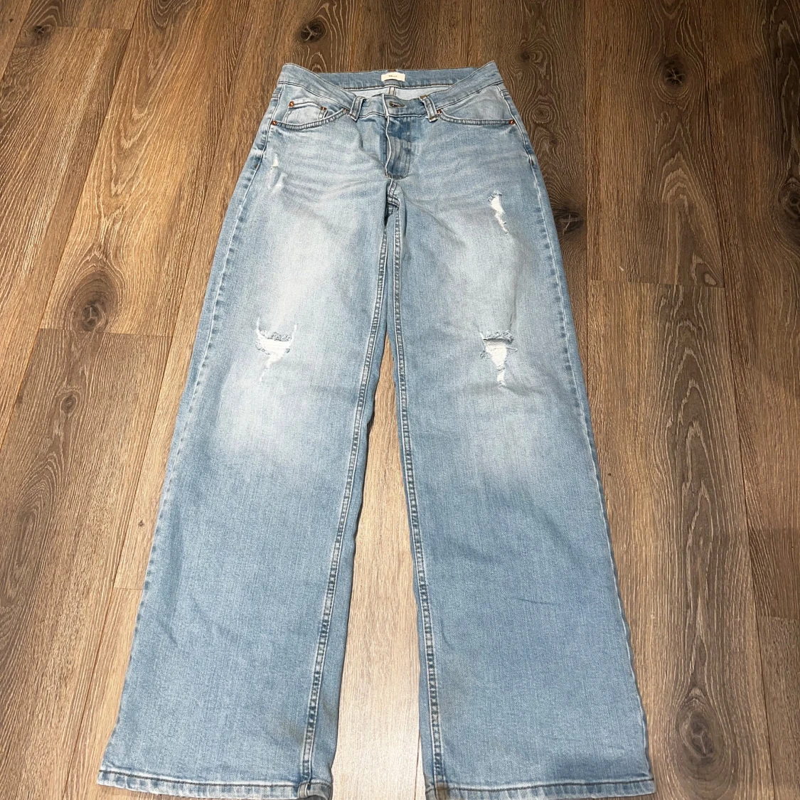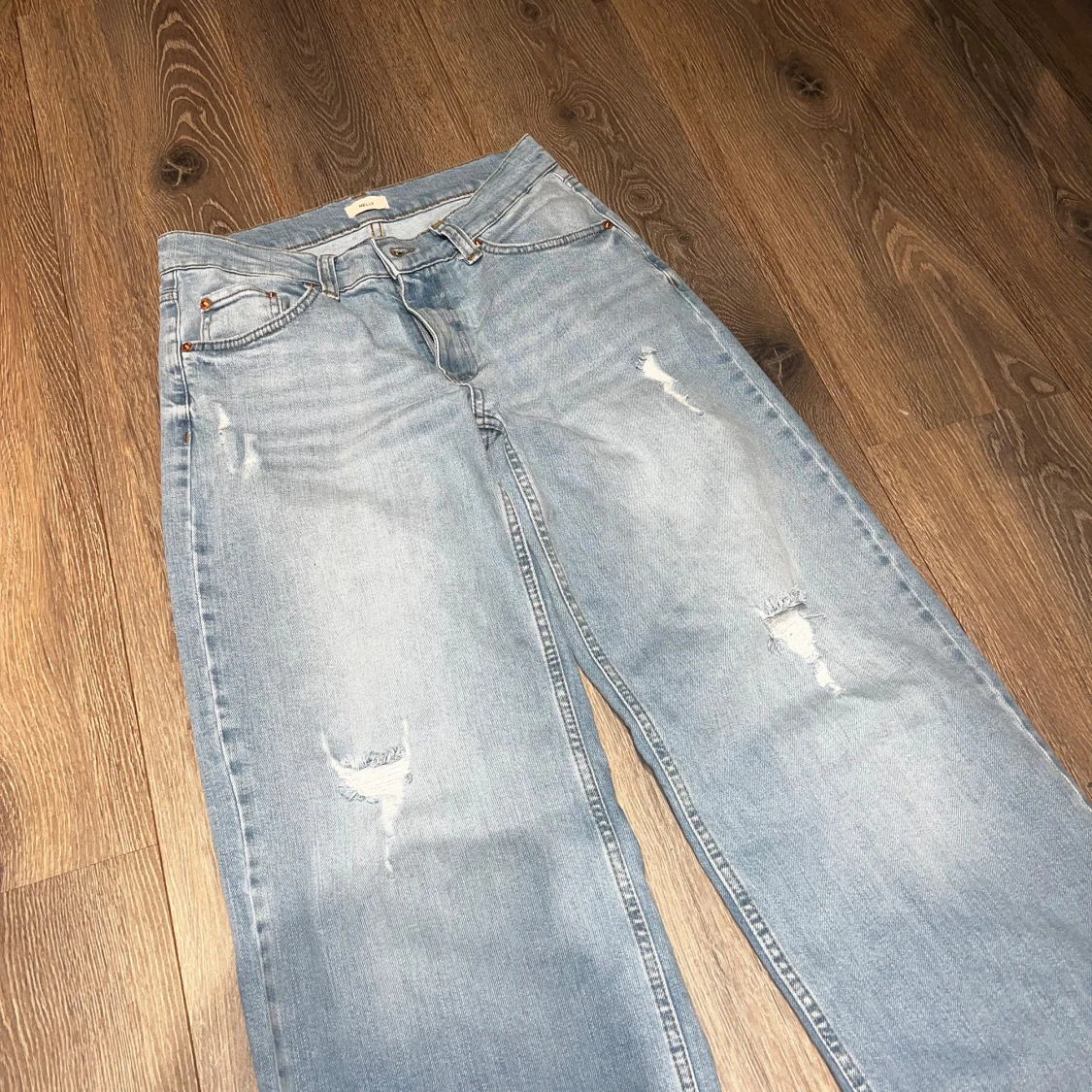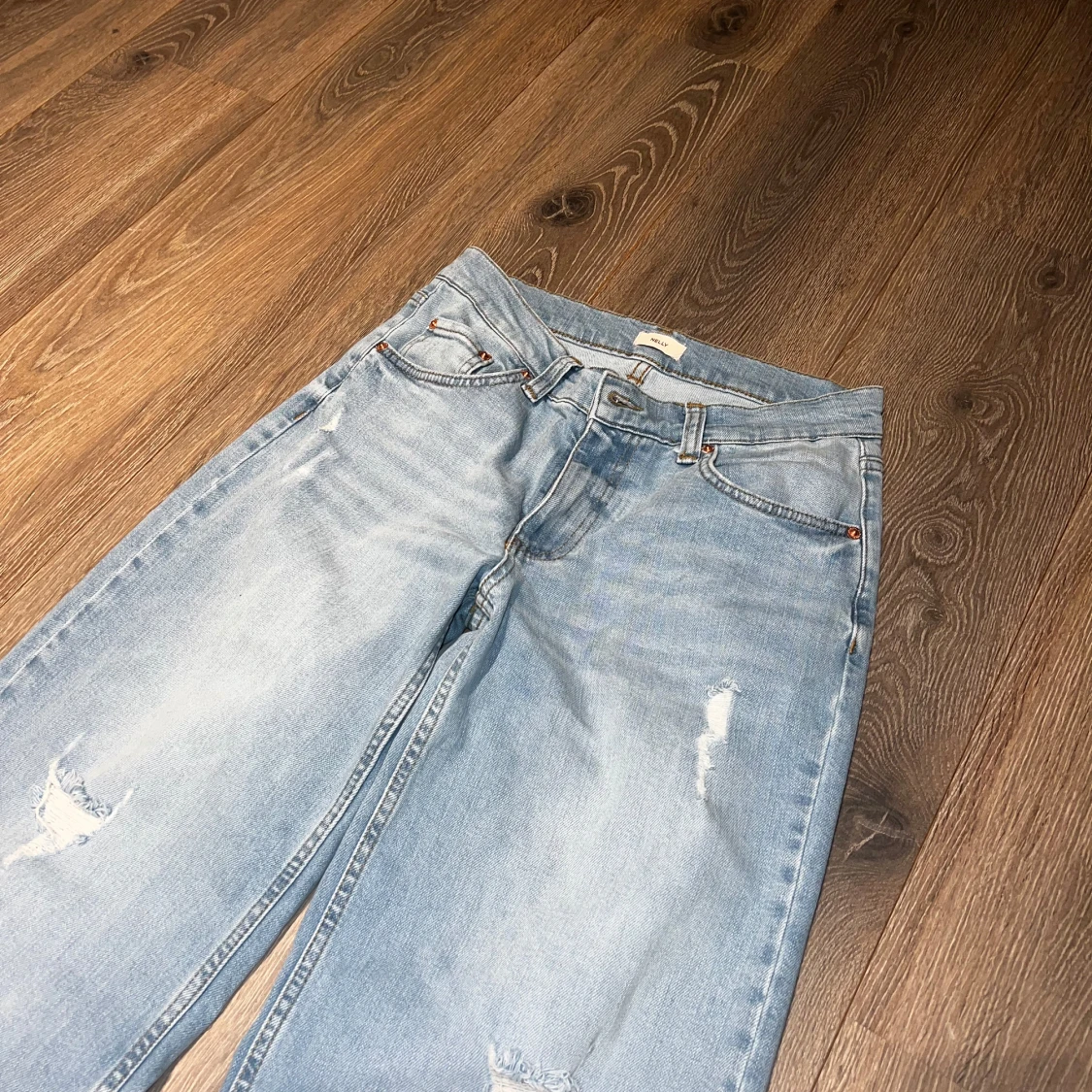 Säljer ett par ljusblå jeans med loose fit ch snygga slitningar på låren och knäna. Jeansen har klassisk femficksmodell, låg midja och är tillverkade i denim. Perfekta för en avslappnad och trendig look.