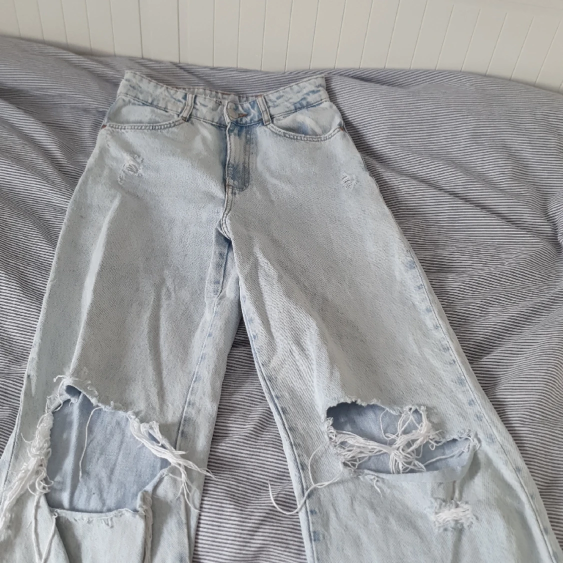 Högmidjade med hål på knäna. Säljer pga inte min stil längre. Använda men ändå bra skick. Har dock lite småfläckar längst ner på benen som knappt syns, kanske går att tvätta bort.