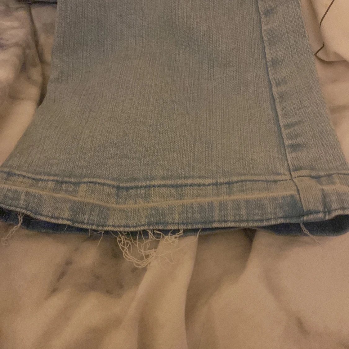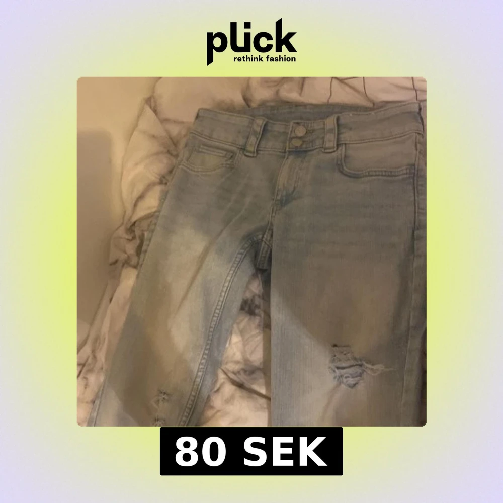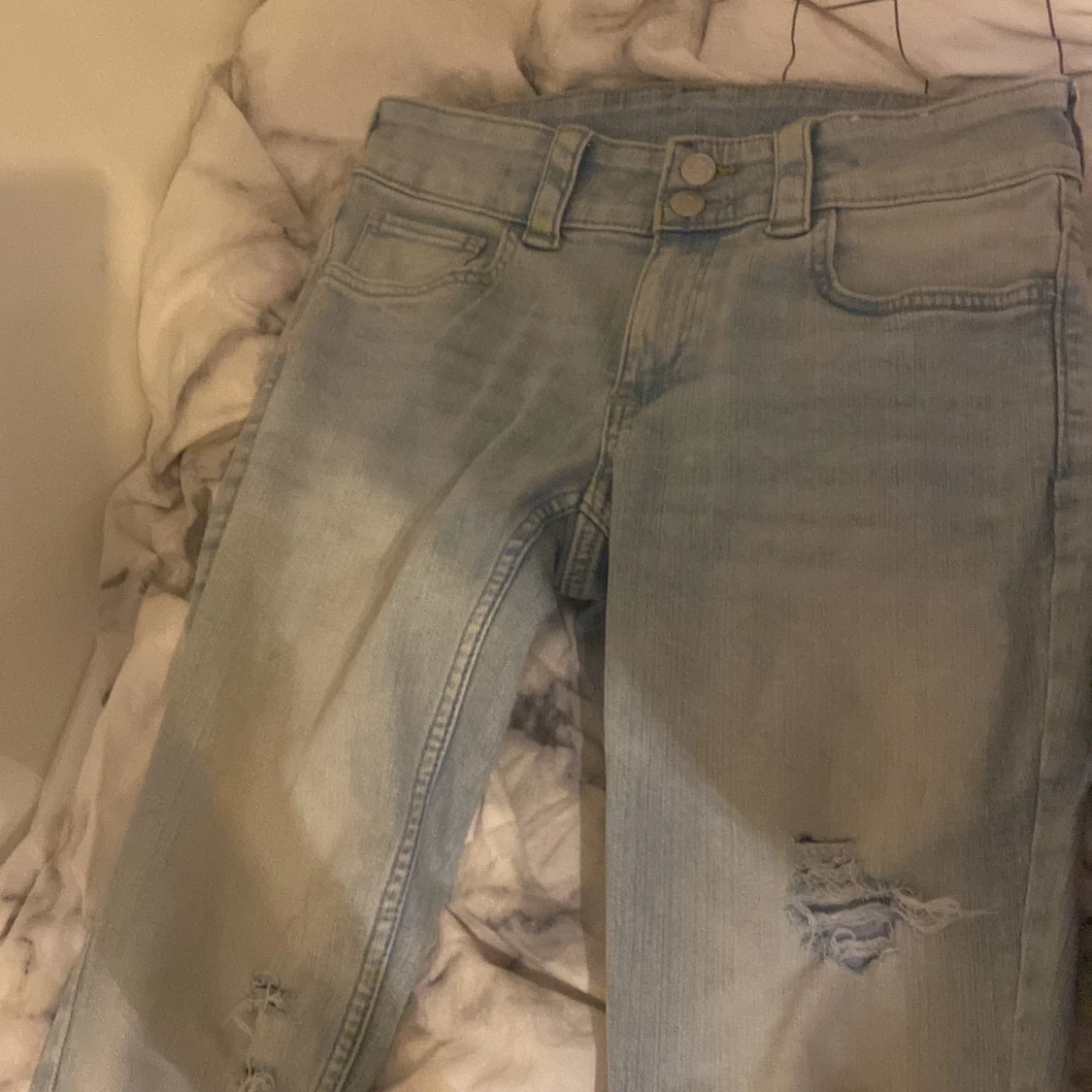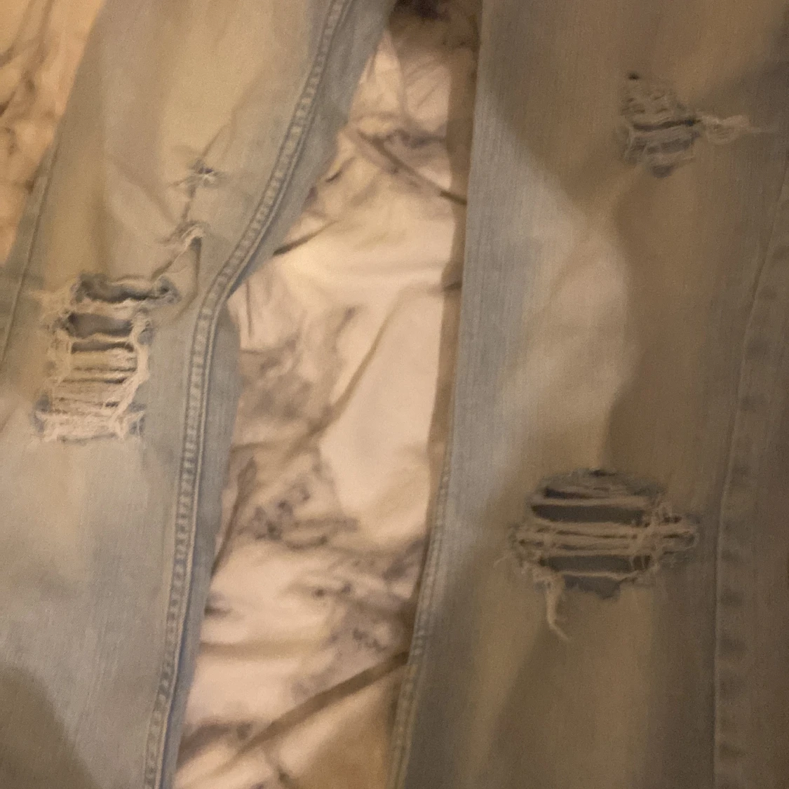 ljusblåa jeans från hm med hål som jag har gjort själv och sprättat upp dom längst ner. annars är dem i bra skick utan fläckar och ändats använda 3-4 gånger