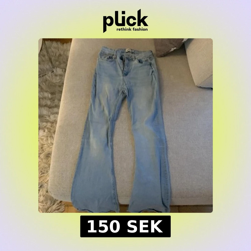 Säljer ett par ljusblåa jeans från 157 i modellen Snake Flare. Jeansen har klassisk femficksdesign, utsvängda ben och normal passform. Perfekta för dig som gillar retrovibbar och vill ha ett par riktigt snygga flare jeans i jeansmaterial.