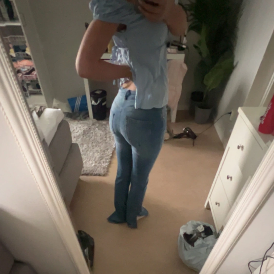 Säljer ett par ljusblå jeans med klassisk femficksdesign och normalhög midja. Jeansen har en smal passform hela vägen ner och är perfekta för en enkel och stilren look. Säljer pga för långa för mig.