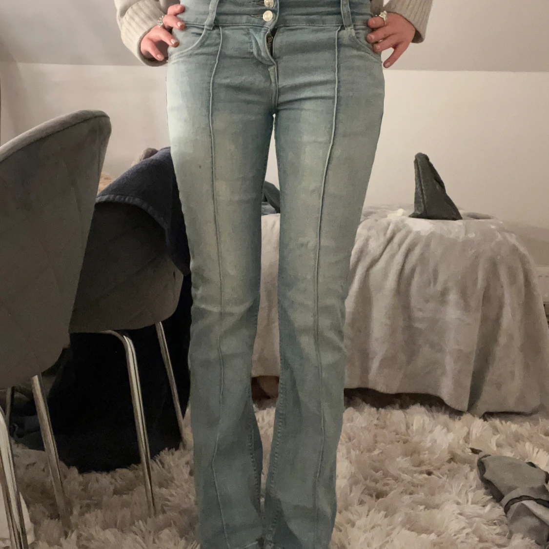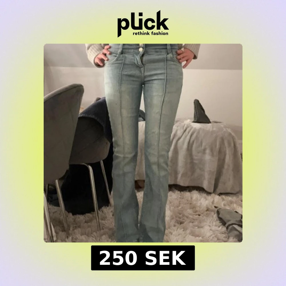 Säljer ett par ljusblå jeans med hög midja och bootcut passform från Bershka. Jeansen har markerade sömmar framtill, dubbla knappar. Mera bilder via privat!🌸