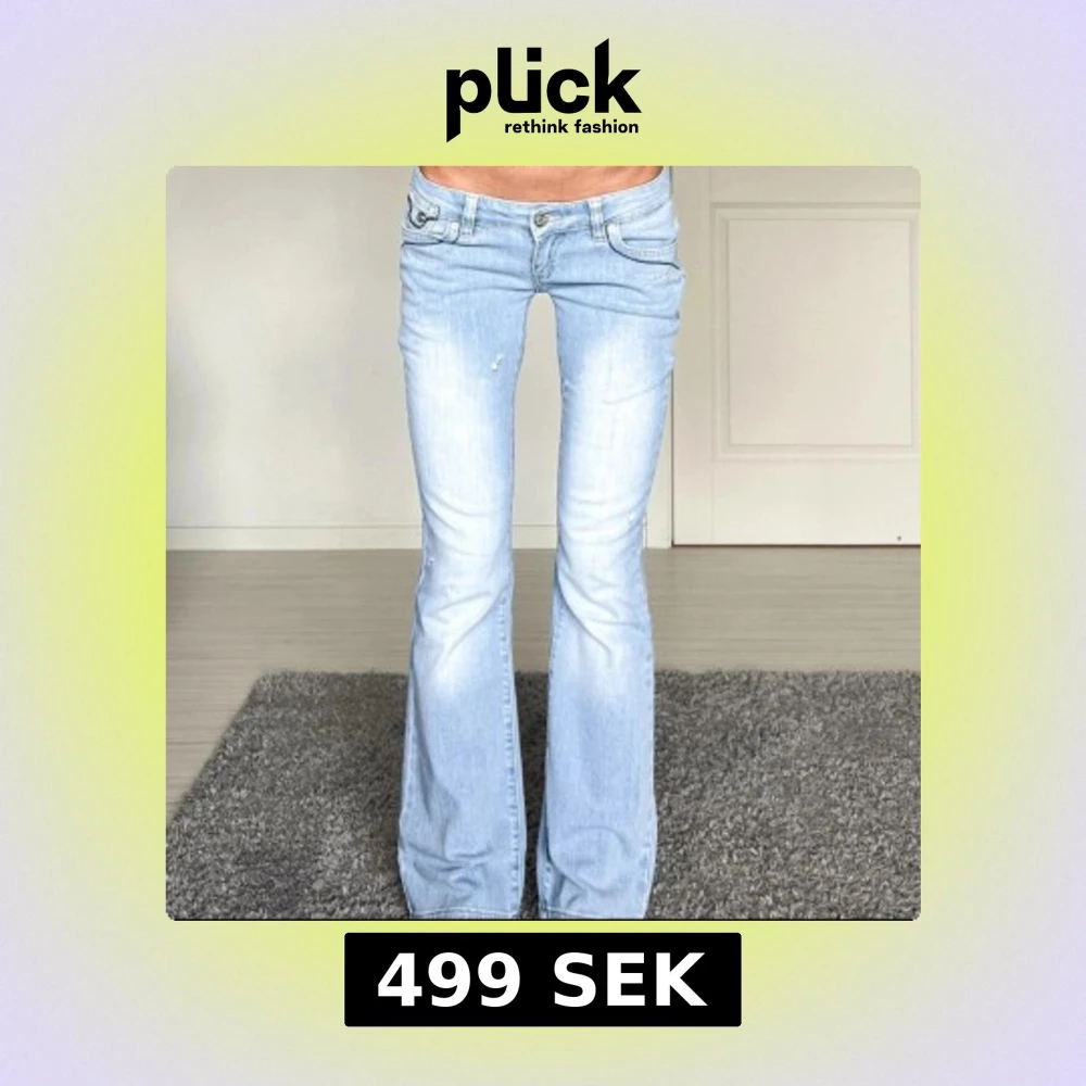 Ett par jättefina ljusblåa, lågmidjade, bootcut jeans. Köpta tidigare på vinted, men jag har inte använt dom alls👌jättebra skick, midjemått: 34cm rakt över innerbenslängd: 78cm💘 lita inte på märket nedanför!!!!!!!!!