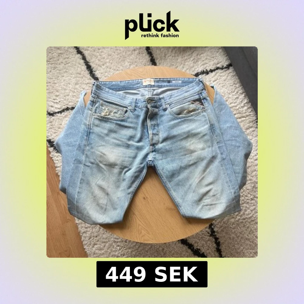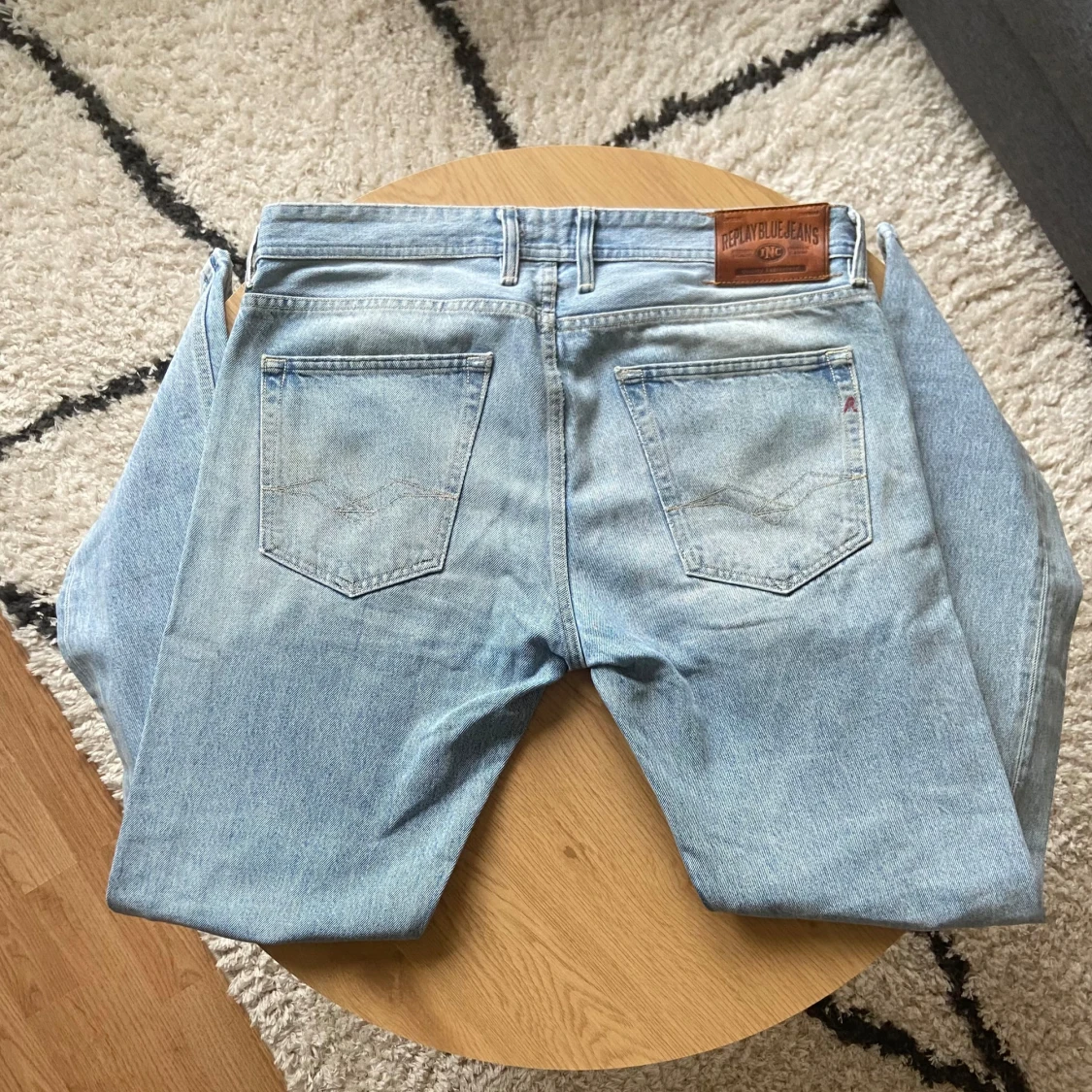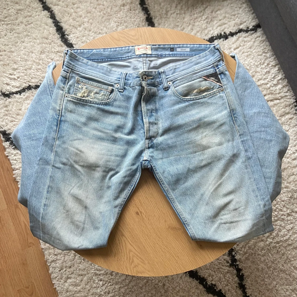 Tjena👋 Säljer ett par ljusblå jeans från Replay med klassisk femficksdesign och snyggt läderpatch bak👖 Jeansen har raka ben och normal passform, tillverkade i slitstarkt bomullsmaterial🪢 Perfekt för dig som gillar en chill och tidlös look🤩 Jeansen är i Grover modell och har storlek W33 L32📐 Vid frågor: Meddela oss!📩