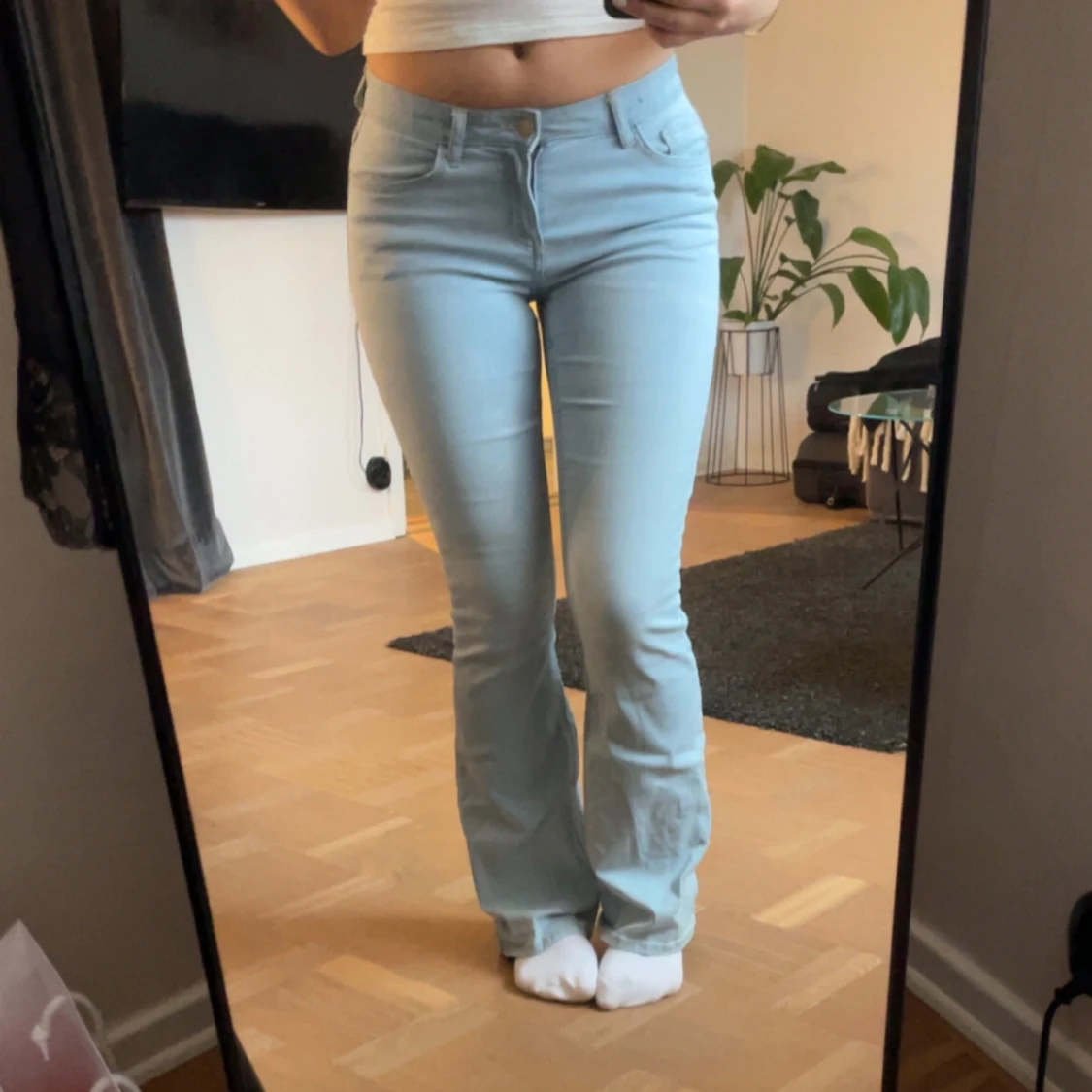 Super sköna ljusblå bootcut jeans! Passar mig som är 170 och vanligtvis bär S👌🏼Har en ljus fläck (som man dock inte tänker jätte mycket på) därav priset!🩵