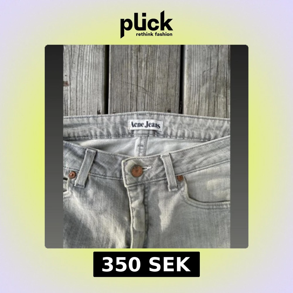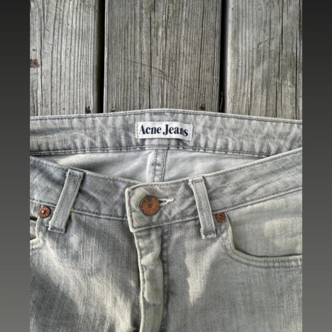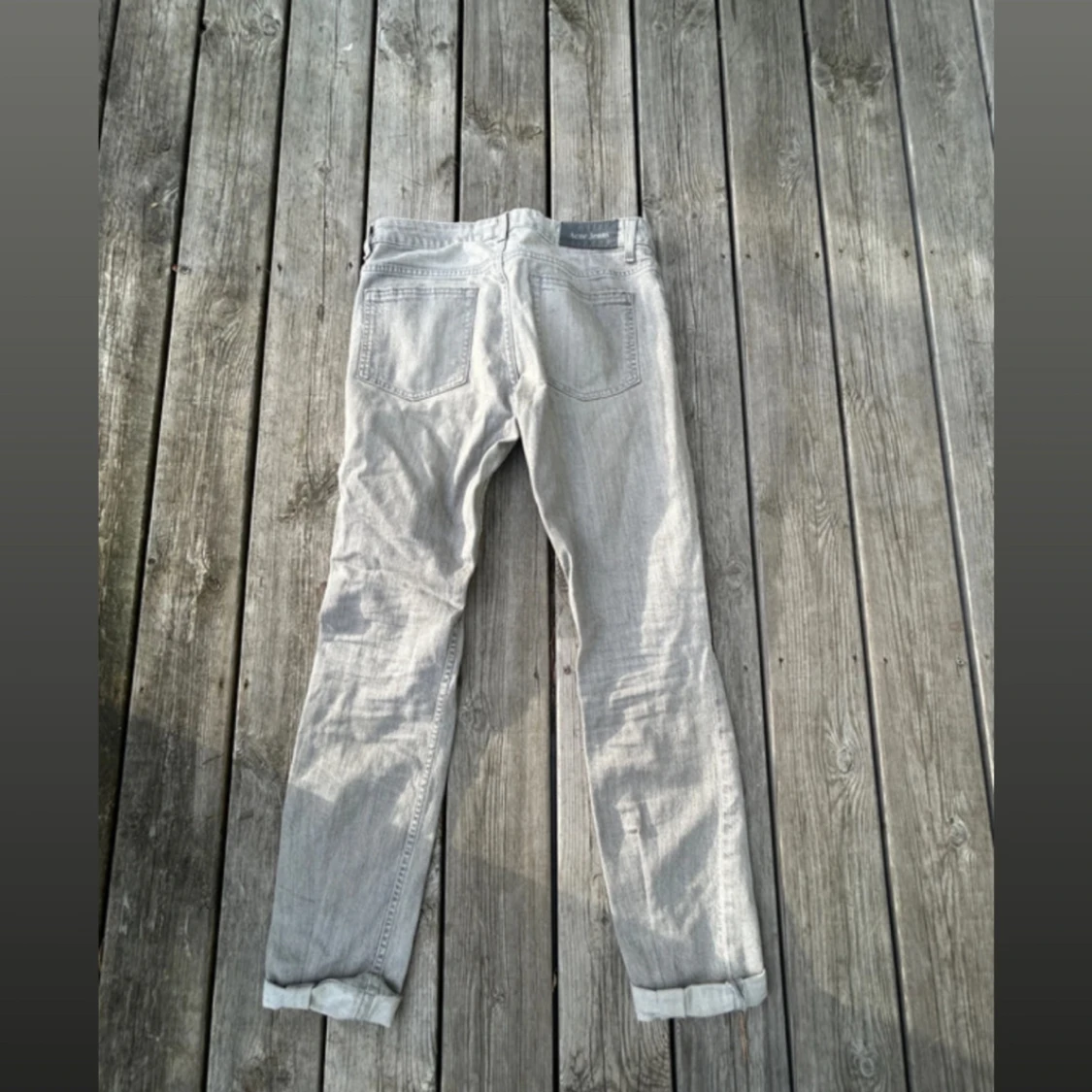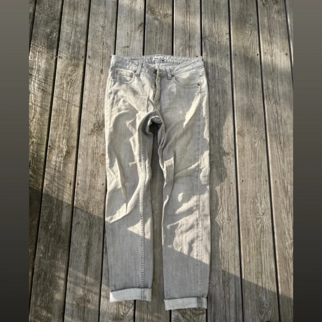 Säljer ett par ljusgrå jeans från Acne Studios med klassisk femficksdesign och slim/rak passform. Jeansen har snygga detaljer som kopparfärgade nitar och knapp, samt uppvikta benslut för en chill vibe. Perfekta för dig som gillar stilrena och minimalistiska plagg. Bara att skriva vid frågor