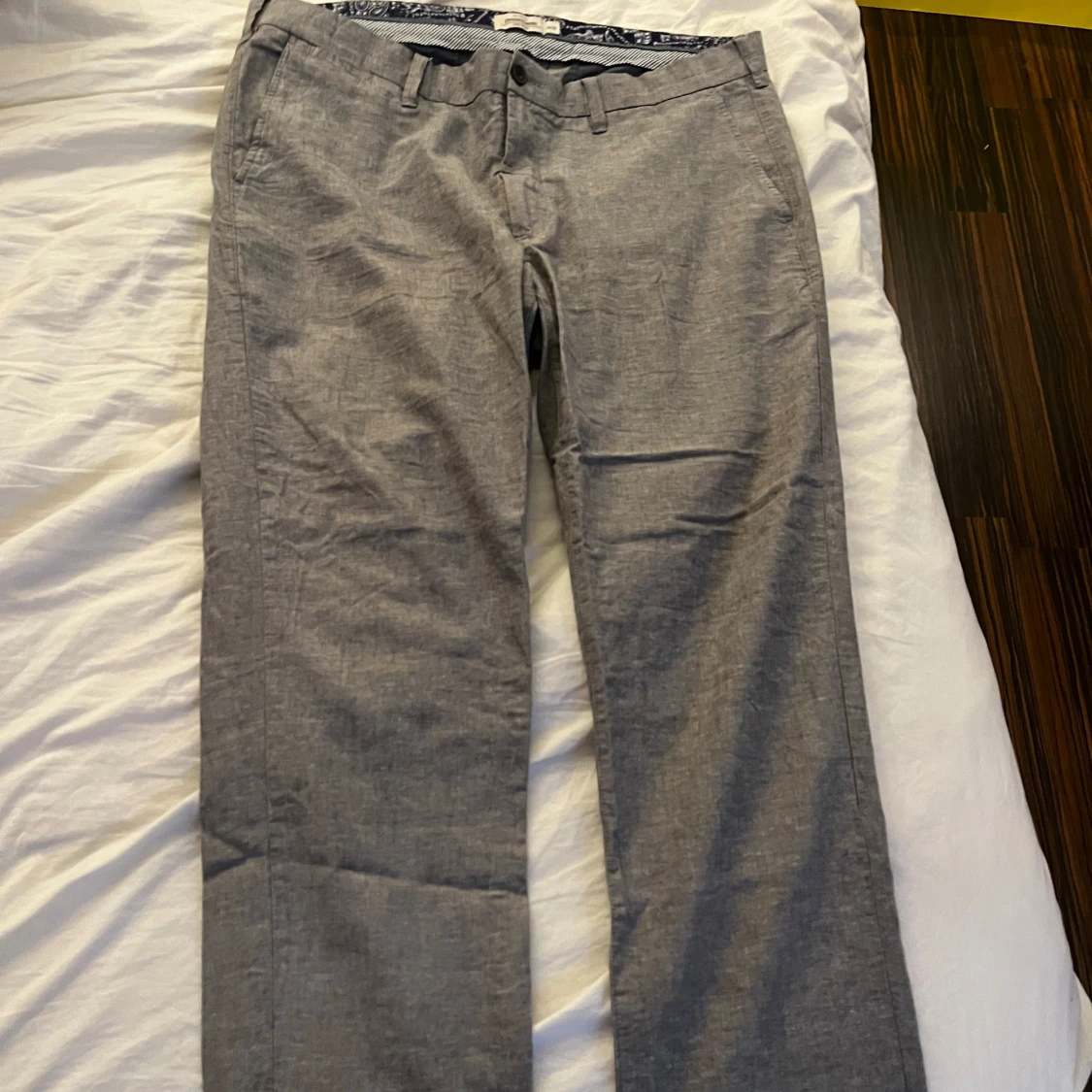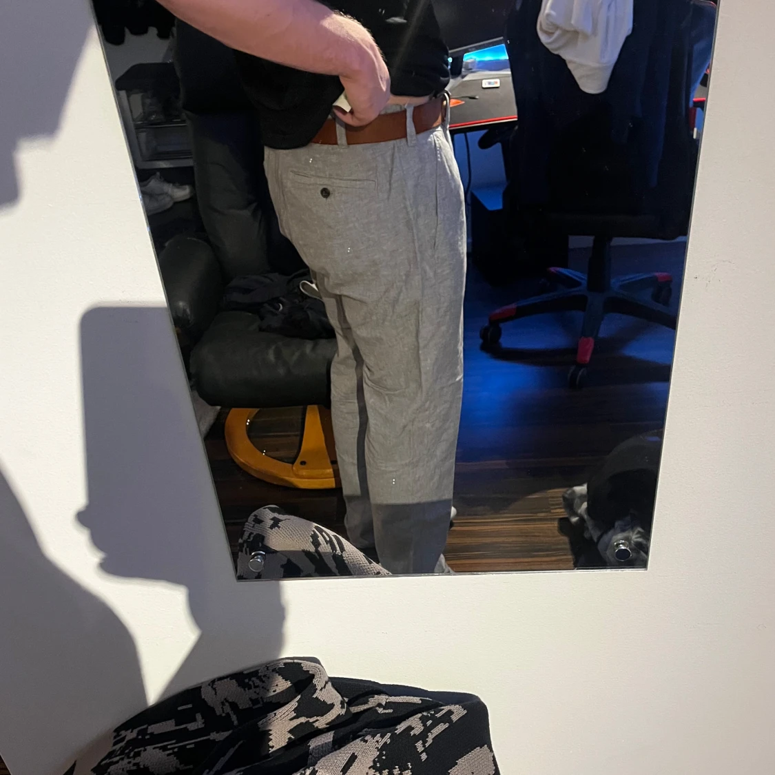 Snygga ljusgrå linnebyxor med klassisk rak passform. Sköna och luftiga, perfekta för varmare dagar. Sitter bra runt benen men lite för stora runt midjan för min del så skärp behövs ofta och då fungerar de fint o sitter bra!