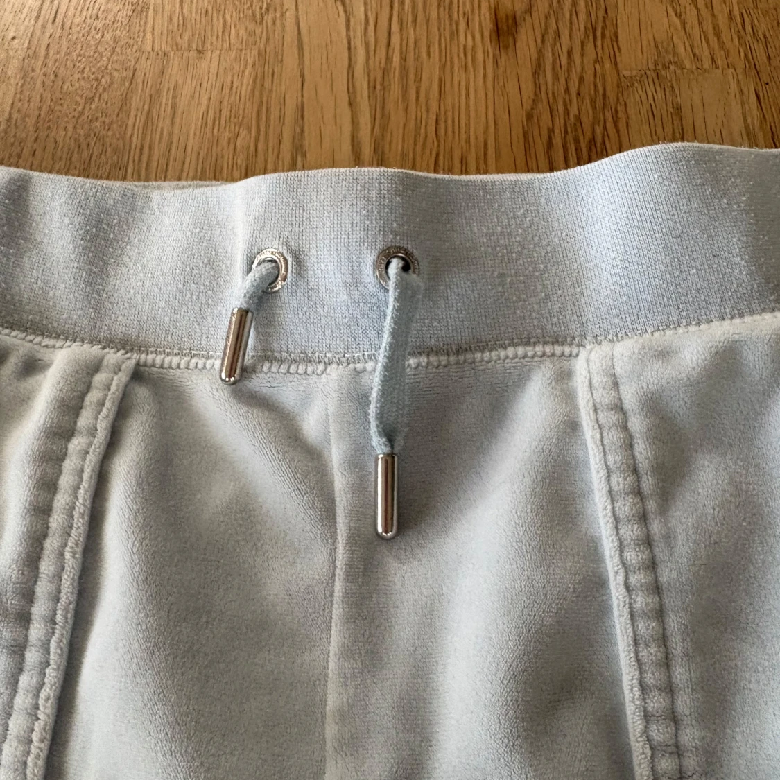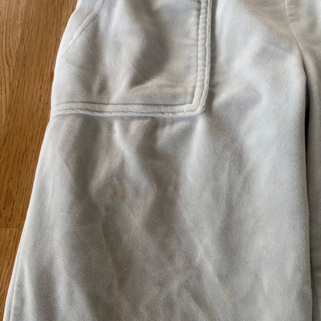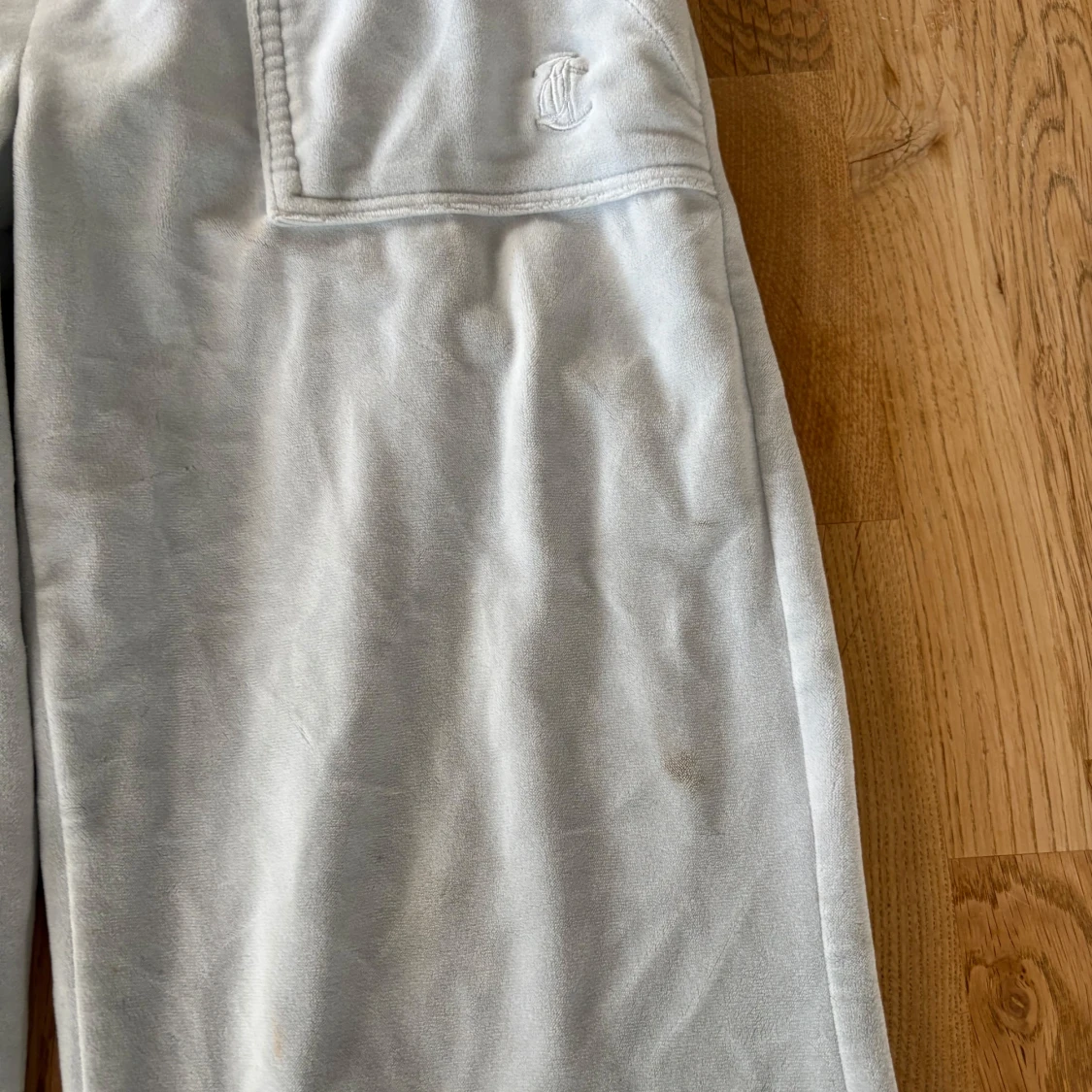 Ljusblå juicy couture byxor i storlek XS. De är i använt skick därmed billigt pris och fläckar lite här och var, har inte provat att få bort med något medel eller så. Fortfarande super skönt material och hyfsat skick utom fläckarna. 🩵