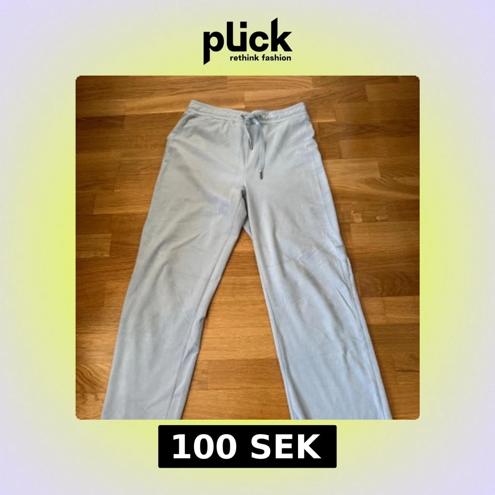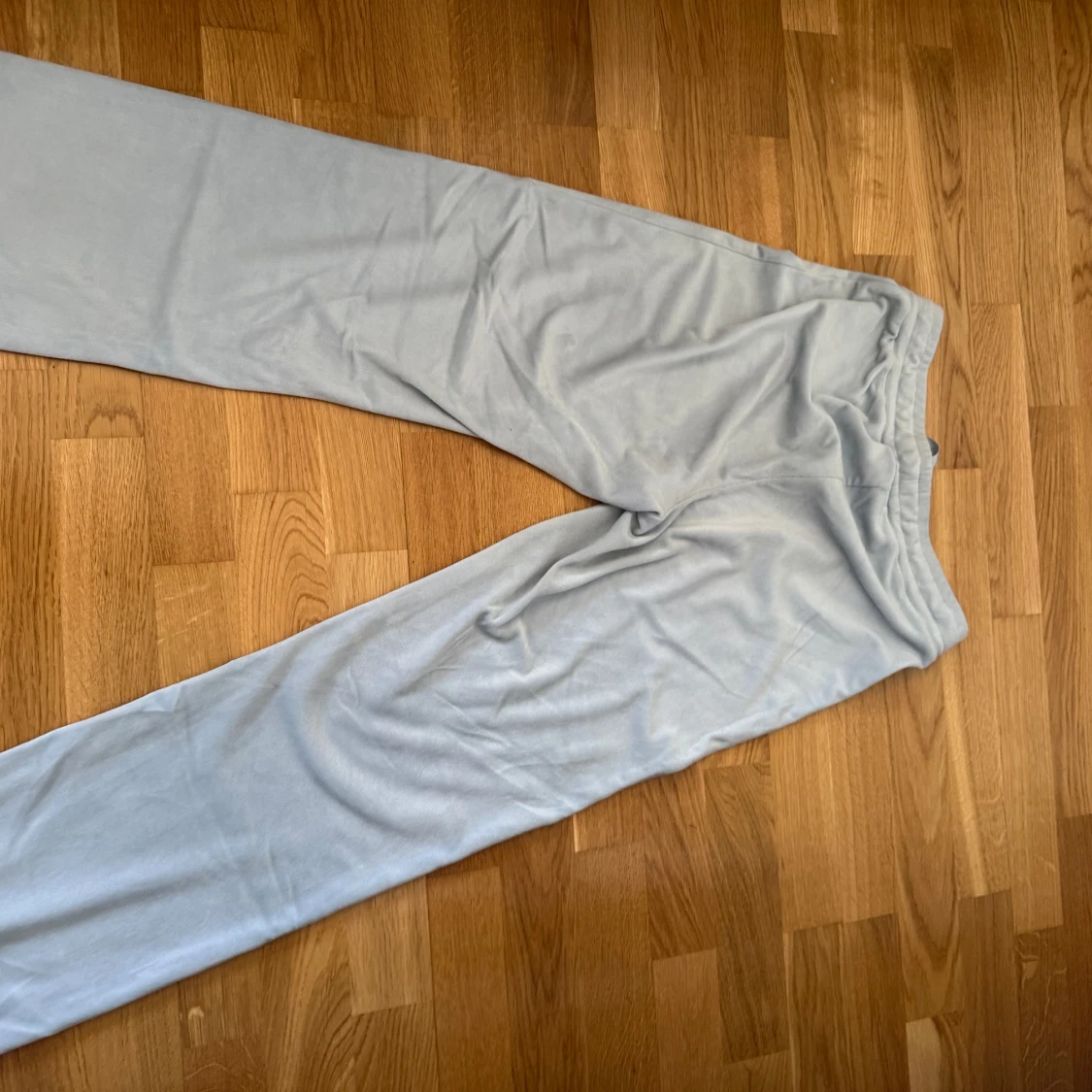 Säljer ett par ljusgrå mjukisbyxor med resår och dragsko i midjan. Byxorna har raka ben och är tillverkade i ett mjukt material som passar perfekt för en avslappnad stil.