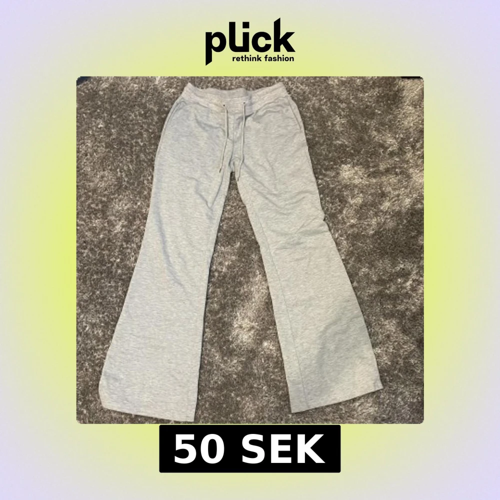 Säljer ett par ljusgrå mjukisbyxor med utsvängda ben och dragsko i midjan. Byxorna har en relaxed fit och är perfekta för en chill och avslappnad stil. Mjukt material som känns skönt mot huden.