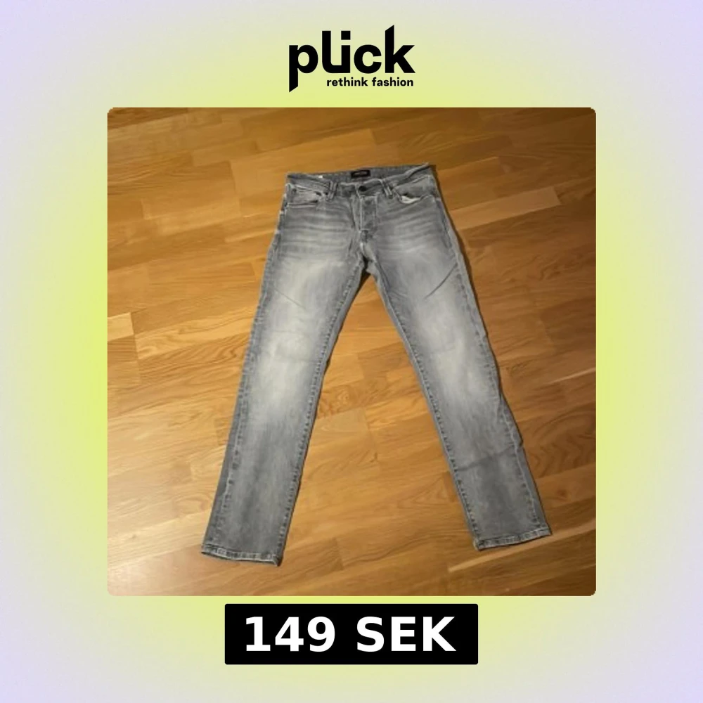Säljer ett par ljusgrå slim fit jeans från Jack & Jones, modell Glenn. Jeansen har klassisk femficksdesign, snyggt slitna detaljer och raka ben. Perfekta för dig som gillar en smalare passform och stilren look.