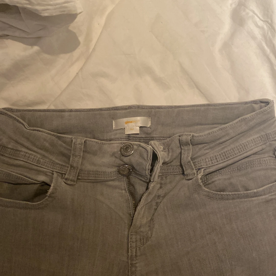 säljer mina lågmidjade gråa jeans från gina young!! storlek 152 och midjemått(tvärs över)≈32 cm och innebenslängd≈72❤️❤️kontakta för fler bilder och pris kan diskuteras 🥰🥰