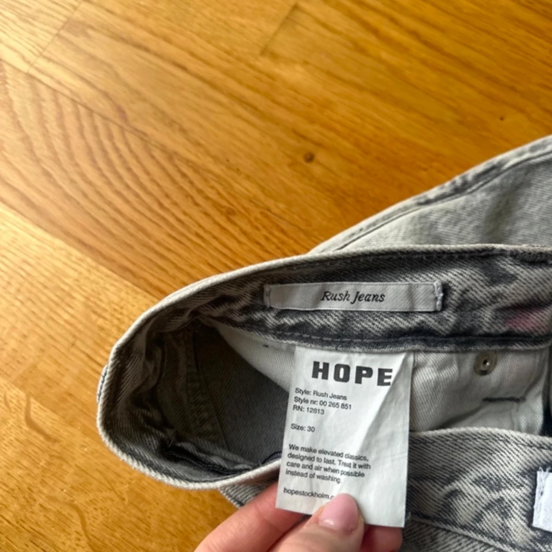 Snygga grå jeans från Hope med en klassisk straight passform. Tillverkade i Portugal. De är i storlek 30. De är väldigt sparsamt använda! Så i princip nyskick. Nypris 1600kr. Skriv för fler bilder.