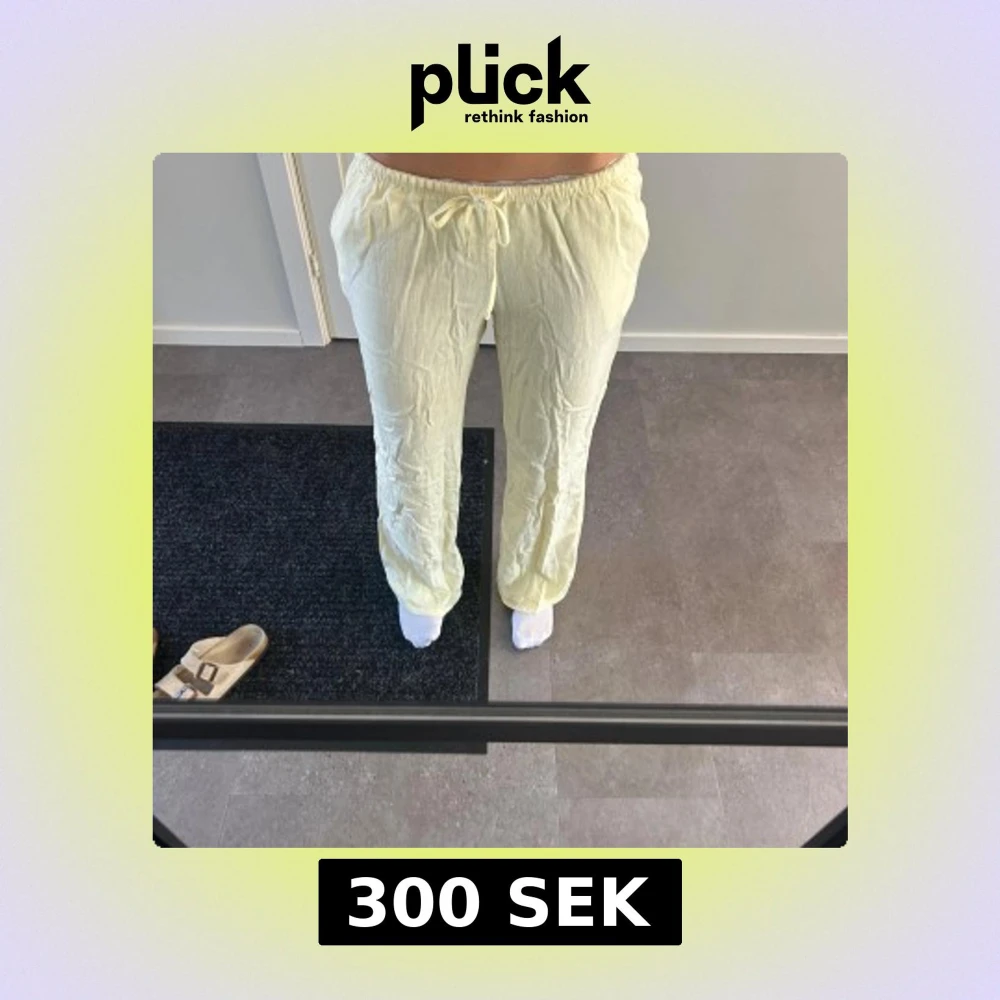 Säljer ett par ljusgula linnebyxor i storlek S. Byxorna har elastisk midja med snörning och raka ben. Helt nya utan prislapp.