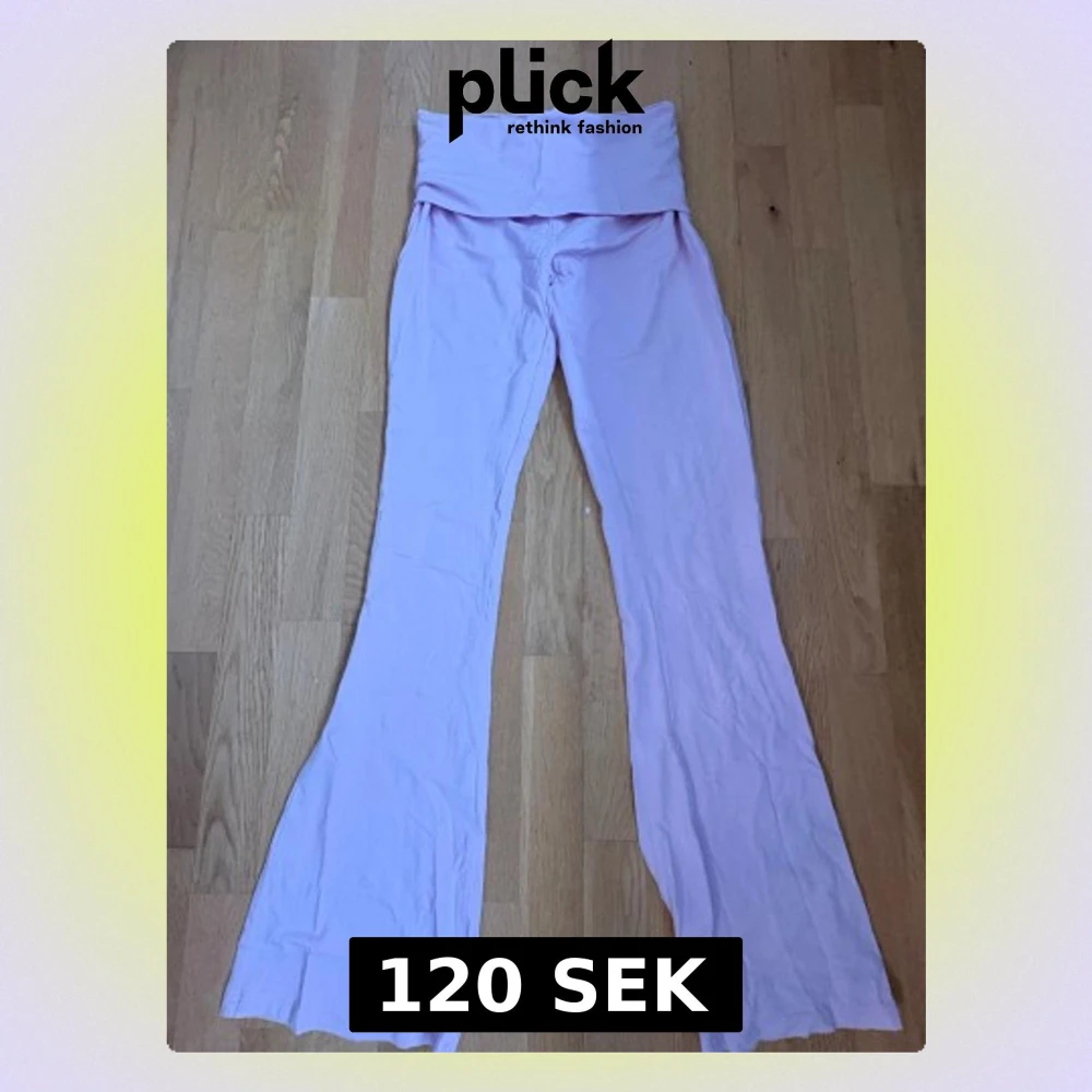 Säljer ett par ljusrosa bootcut byxor i mjukt stretchigt material, storlek XS. De har en bred, hög midja som kan vikas ner och långa ben med utsvängda avslut. Perfekta för dig som gillar bekväma och snygga byxor med lite extra attityd.