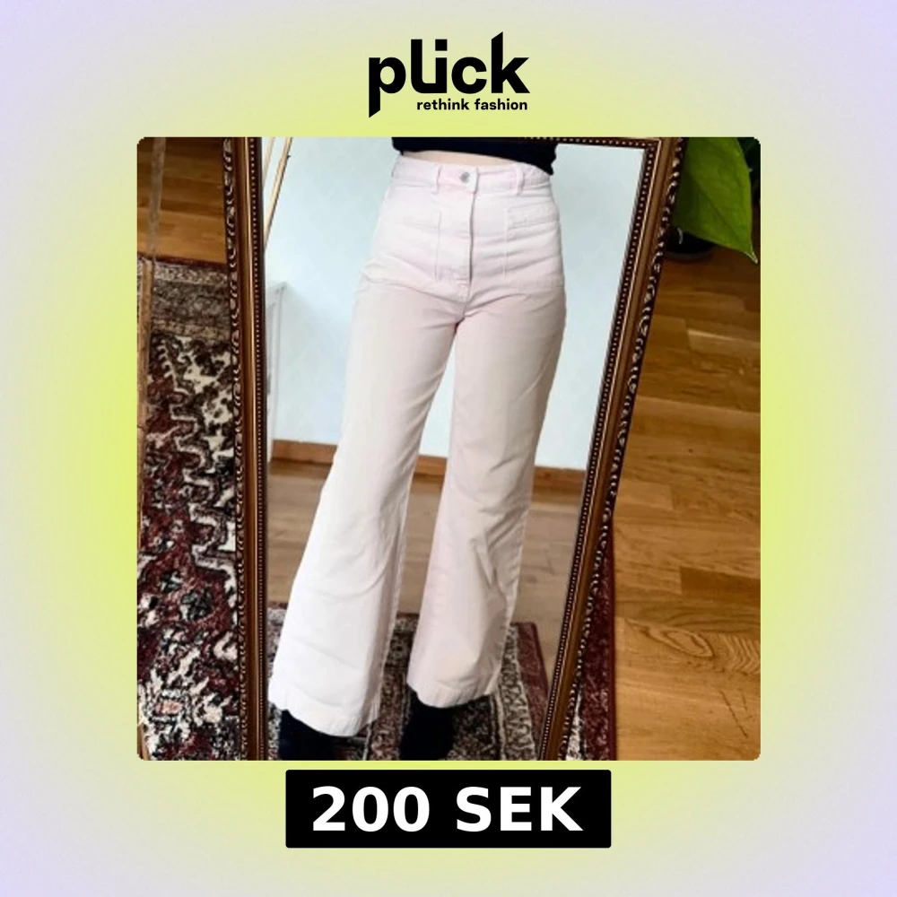 Säljer ett par ljusrosa jeans från Rollas med hög midja och bredare nedtill (High rise, wide leg). Säljer för att den satt lite för tajt i midjan🙃Men äälskar färgen😍Står dock size 26 på dem och vet ej vad det ska betyda, haha? Men skulle väl säga att de känns som 36 :)