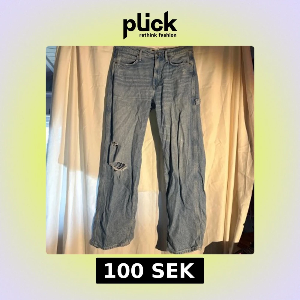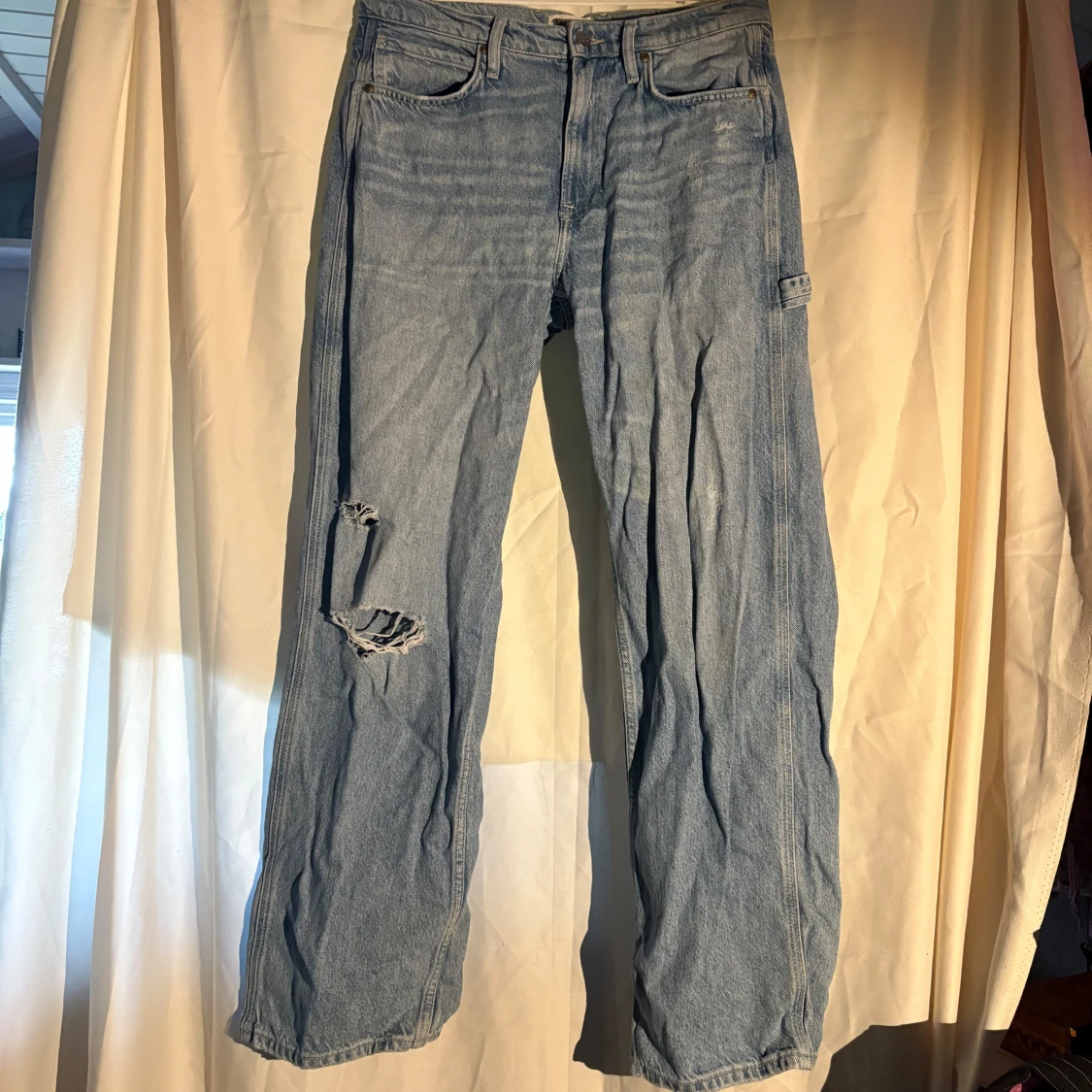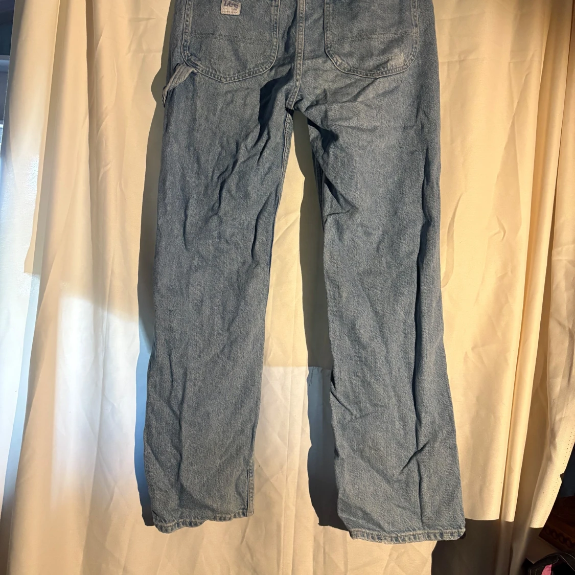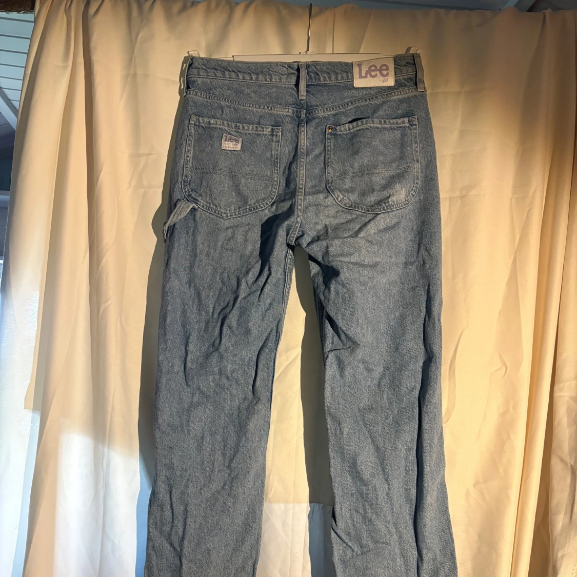 Ljusblå jeans från Lee H&M. Jeansen har en snygg sliten detalj med hål på ena knät och Lee-logga på bakfickan. Tillverkade i bomull och har en avslappnad, rak passform.