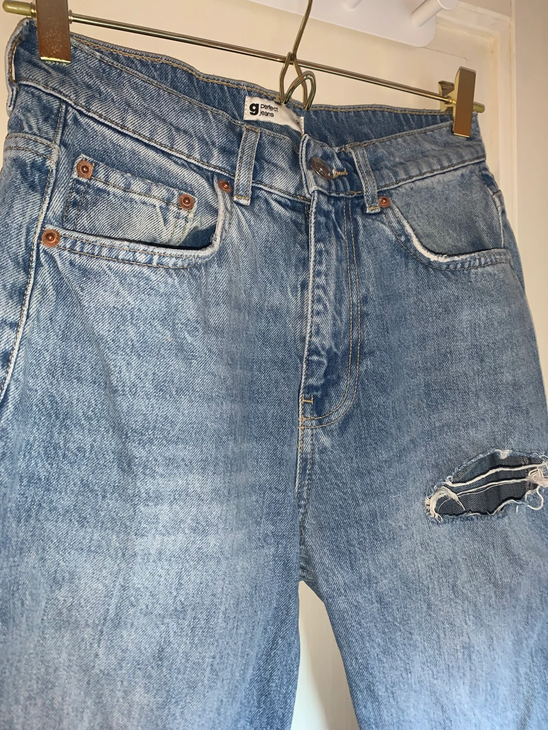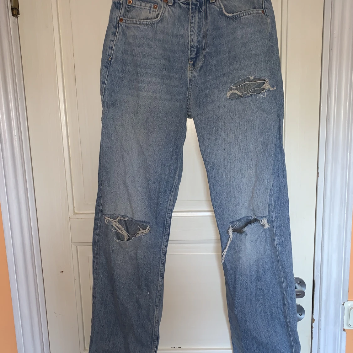 Bekväma, använda fåtal gånger, loose fit. Tre hål, straight fit med något utsvänga längst ner. ’Normalmidjade’