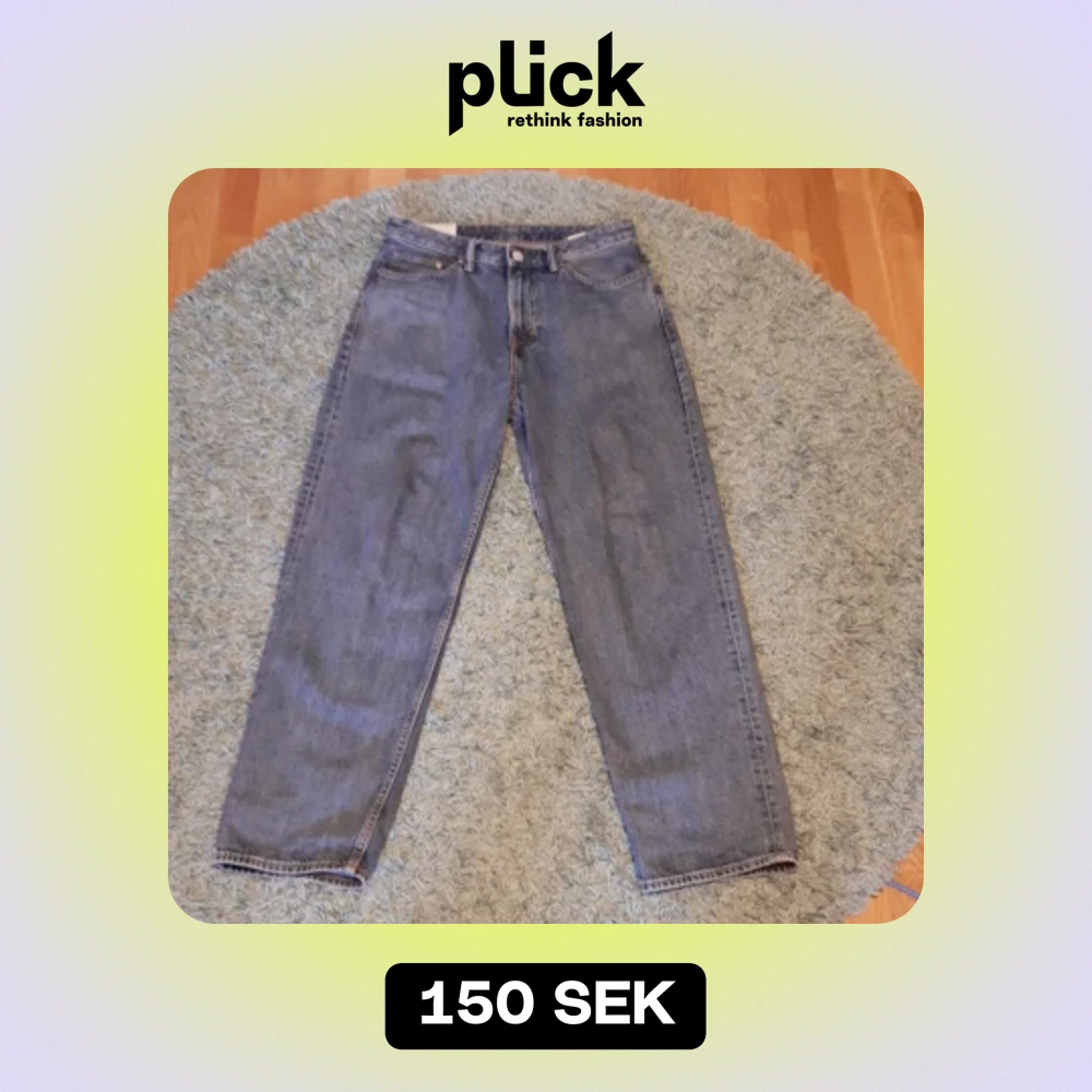 Säljer ett par blå jeans från H&M i storlek 30/32. De har en loose fit passform och är tillverkade i Bangladesh. Jag säljer dem för att dem är för långa. Dem är lite slitna längst ner vid benen.