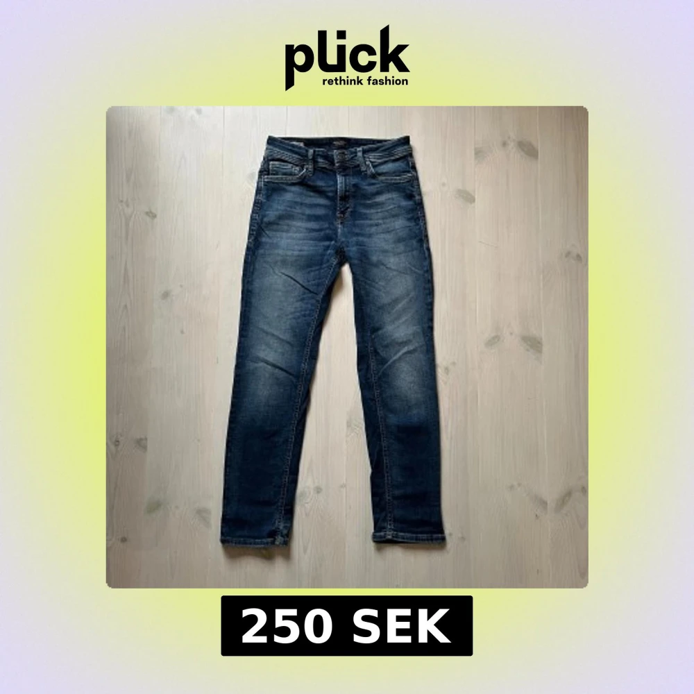 Snygga blå jeans från Jack & Jones, modell Regular Clark. Klassisk femficksdesign med raka ben och normal passform. Jeansen har en mörkblå tvätt med lätt slitning och kontrastsömmar. Perfekta för en avslappnad och stilren look.